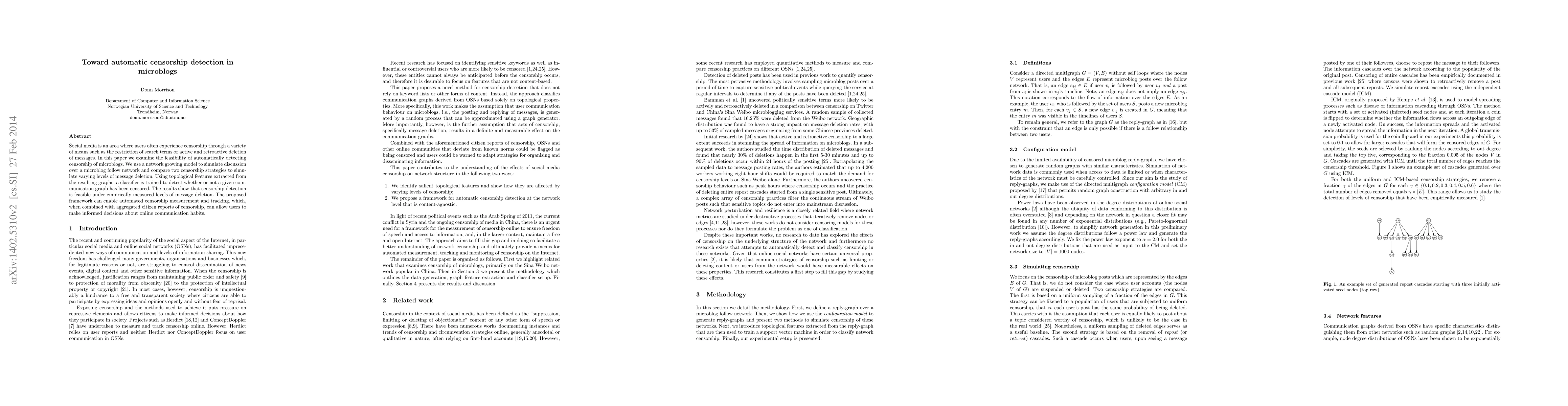 This paper explores the feasibility of automatically detecting censorship in microblogs using a network growing model and topological features. It demonstrates that a classifier can identify censored communication graphs based on varying levels of message deletion, suggesting a potential framework for automated censorship measurement and tracking.