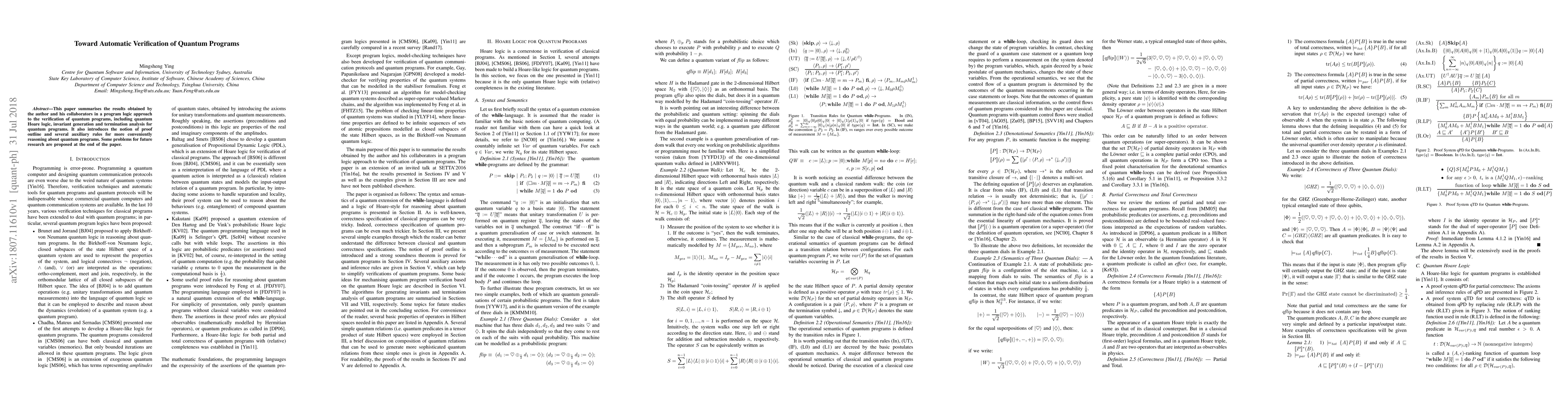 This paper presents a logic-based framework for verifying quantum programs, introducing quantum Hoare logic, invariant generation, and termination analysis, along with proof outlines and auxiliary rules to facilitate reasoning. It also outlines future research directions in this emerging field.
