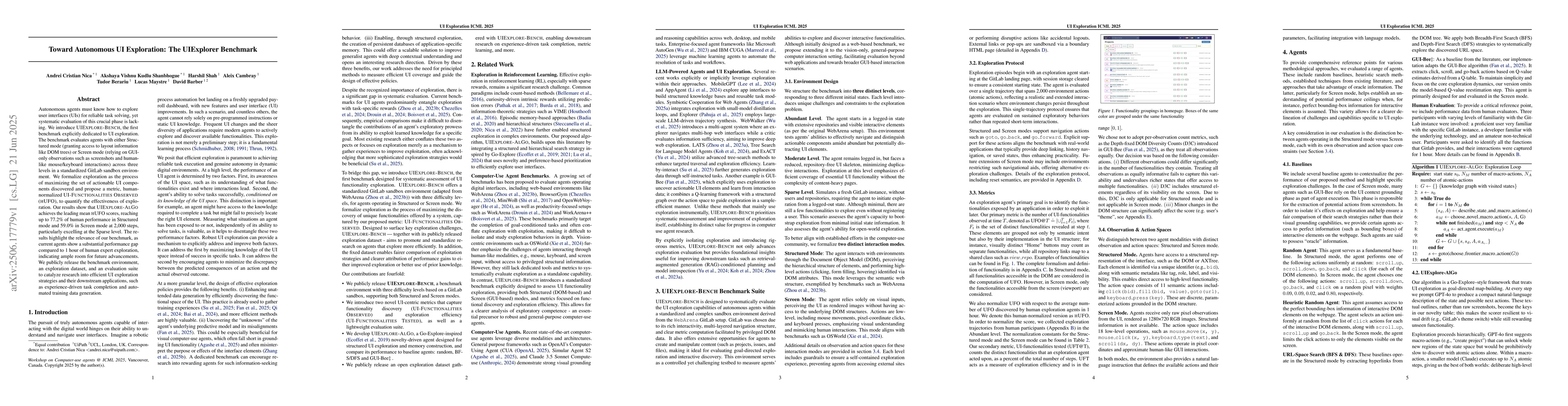 The research introduces UIExplore-Bench, a benchmark for evaluating autonomous UI exploration, using a standardized GitLab sandbox environment. It evaluates agents in Structured mode (with layout information) and Screen mode (with GUI-only observations) across three difficulty levels (Abundant, Moderate, Sparse). The effectiveness of exploration is quantified using the human-normalized UI-Functionalities Observed (hUFO) metric.