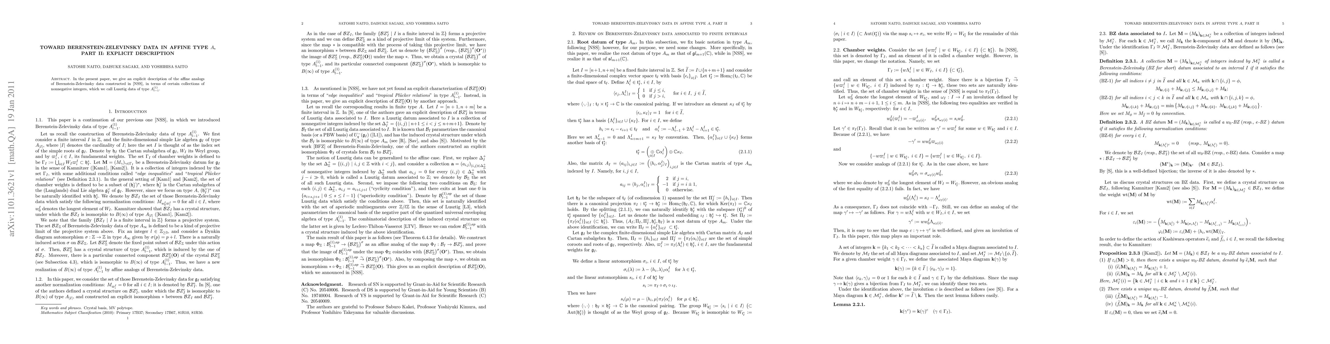 This paper provides an explicit description of the affine analogs of Berenstein-Zelevinsky data, constructed in a previous work, in terms of Lusztig data of type $A_{l-1}^{(1)}$, using collections of nonnegative integers.