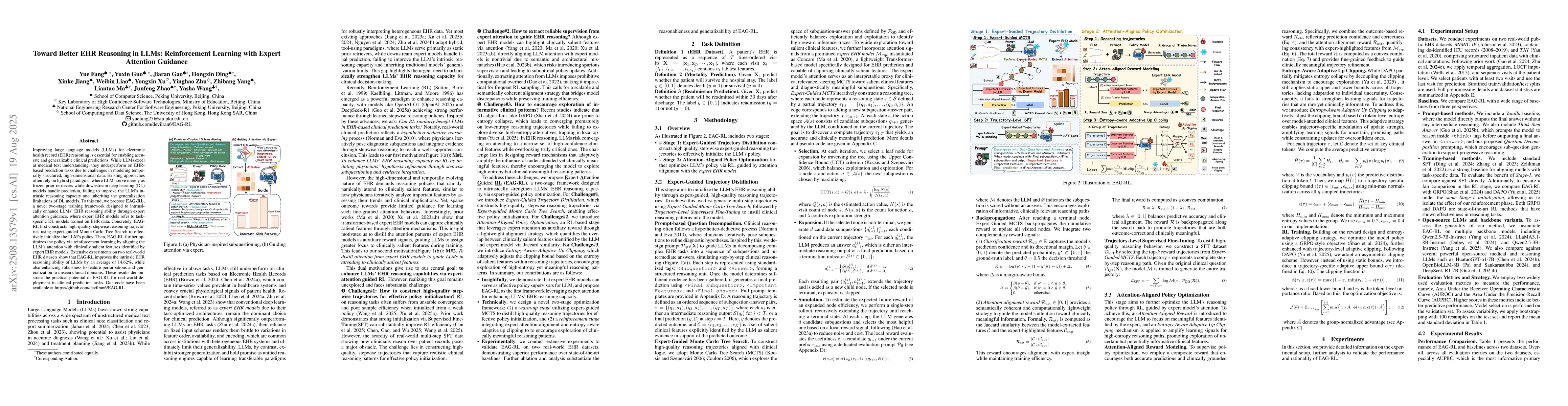 EAG-RL, a novel two-stage training framework that enhances LLMs' EHR reasoning ability through expert attention guidance, combining Monte Carlo Tree Search for trajectory initialization and reinforcement learning for policy optimization.