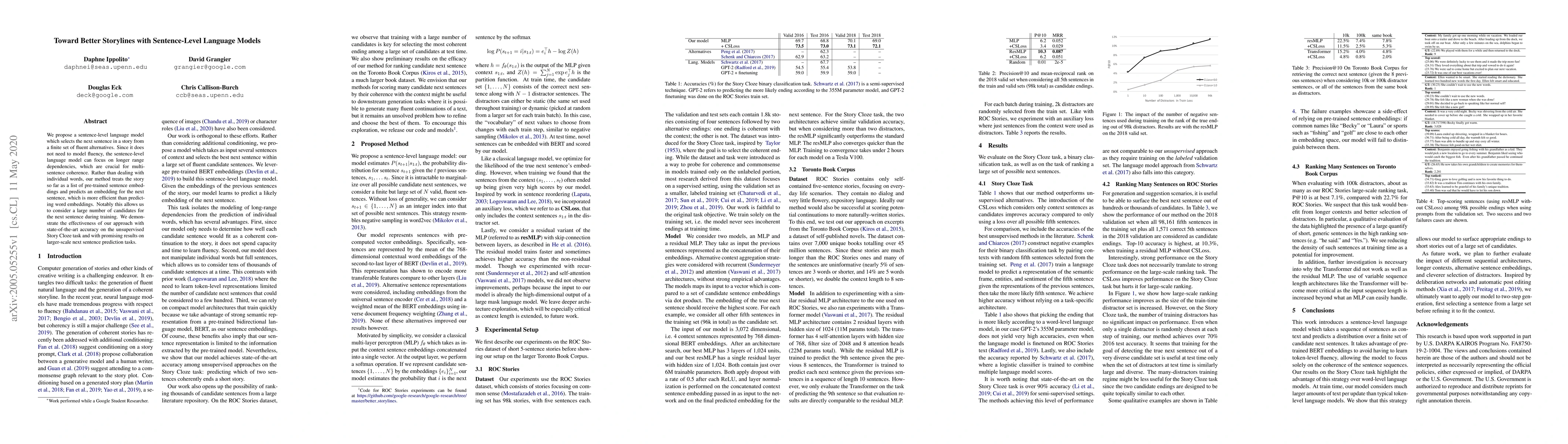 This paper introduces a sentence-level language model that selects the next sentence in a story from a set of fluent alternatives, focusing on longer-range dependencies for coherence. It predicts sentence embeddings rather than word embeddings, enabling more efficient training and better performance on coherence tasks.
