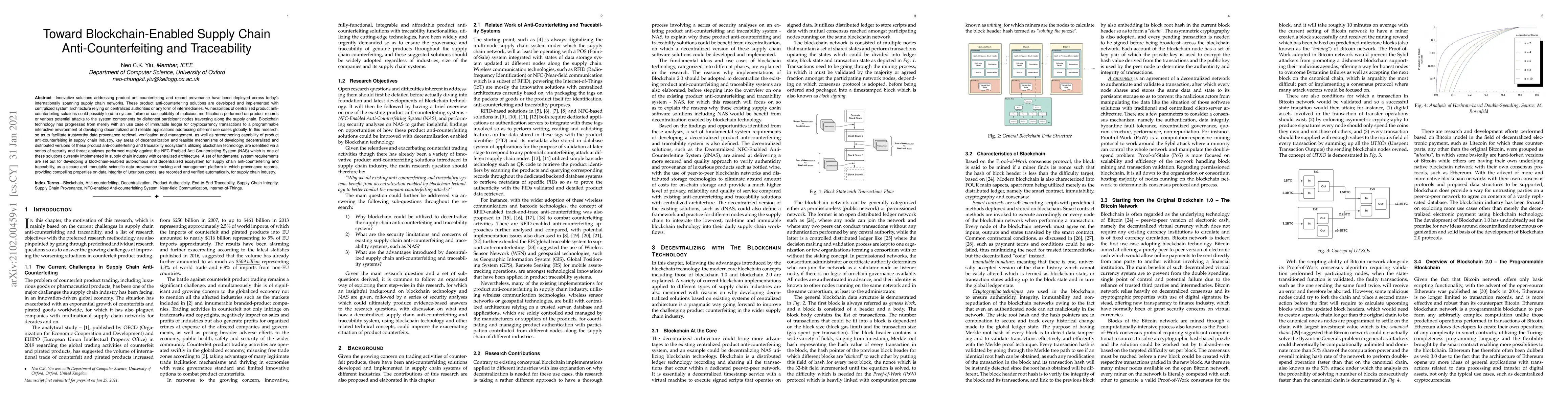 This research explores leveraging blockchain technology to create decentralized and secure supply chain anti-counterfeiting and traceability systems, addressing vulnerabilities in centralized systems and ensuring data integrity through immutable ledgers. It proposes fundamental requirements for a blockchain-enabled autonomous solution for trustworthy product provenance and anti-counterfeiting management.