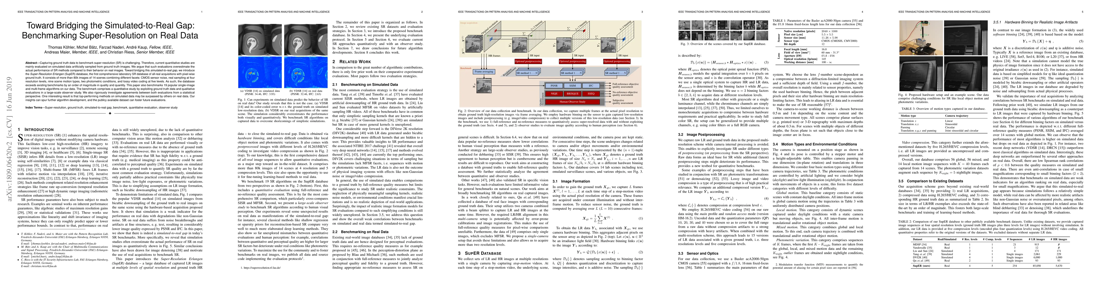 Capturing ground truth data to benchmark super-resolution (SR) is challenging. Therefore, current quantitative studies are mainly evaluated on simulated data artificially sampled from ground truth images. We argue that such evaluations overestimate the actual performance of SR methods compared to their behavior on real images. Toward bridging this simulated-to-real gap, we introduce the Super-Resolution Erlangen (SupER) database, the first comprehensive laboratory SR database of all-real acquisitions with pixel-wise ground truth. It consists of more than 80k images of 14 scenes combining different facets: CMOS sensor noise, real sampling at four resolution levels, nine scene motion types, two photometric conditions, and lossy video coding at five levels. As such, the database exceeds existing benchmarks by an order of magnitude in quality and quantity. This paper also benchmarks 19 popular single-image and multi-frame algorithms on our data. The benchmark comprises a quantitative study by exploiting ground truth data and qualitative evaluations in a large-scale observer study. We also rigorously investigate agreements between both evaluations from a statistical perspective. One interesting result is that top-performing methods on simulated data may be surpassed by others on real data. Our insights can spur further algorithm development, and the publicy available dataset can foster future evaluations.