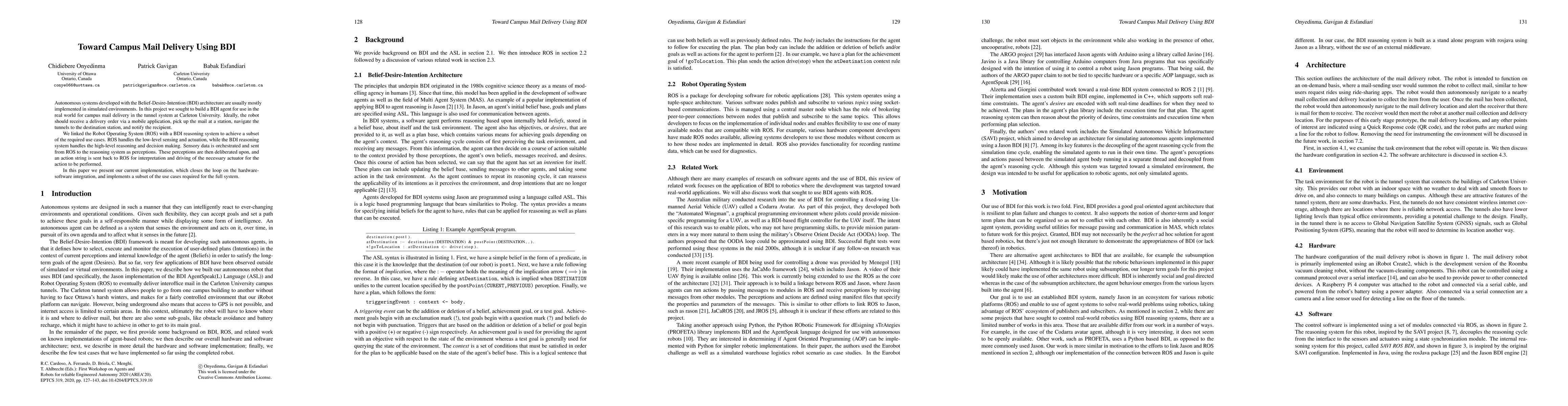 This paper details the development of a BDI-based autonomous robot for campus mail delivery at Carleton University, integrating the Robot Operating System with a BDI reasoning system to handle navigation and delivery tasks. The robot receives orders via a mobile app, navigates tunnels, and notifies recipients, showcasing a partial implementation of the envisioned system.