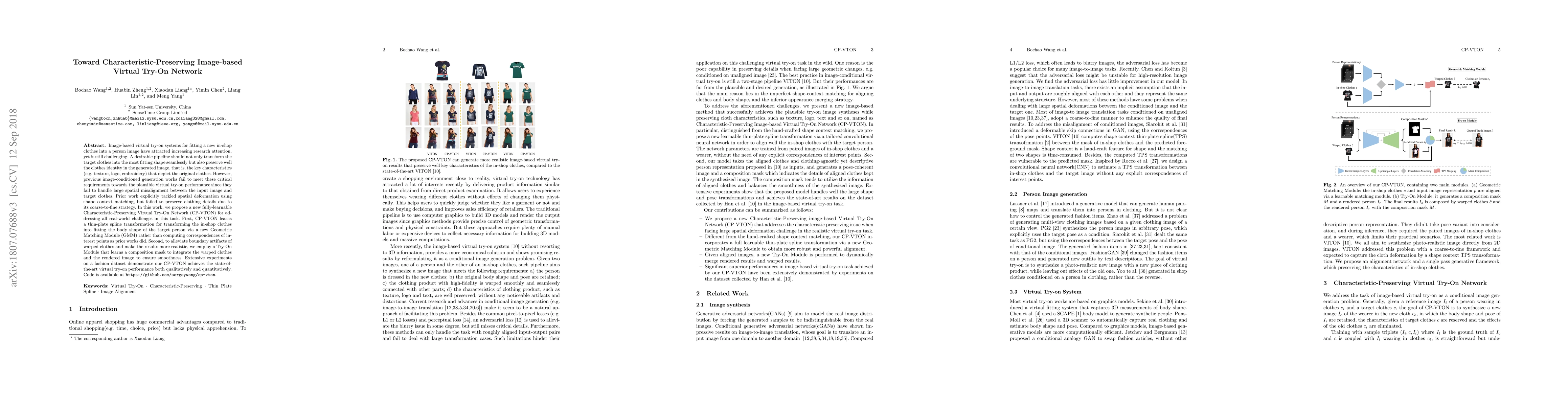 Image-based virtual try-on systems for fitting new in-shop clothes into a person image have attracted increasing research attention, yet is still challenging. A desirable pipeline should not only transform the target clothes into the most fitting shape seamlessly but also preserve well the clothes identity in the generated image, that is, the key characteristics (e.g. texture, logo, embroidery) that depict the original clothes. However, previous image-conditioned generation works fail to meet these critical requirements towards the plausible virtual try-on performance since they fail to handle large spatial misalignment between the input image and target clothes. Prior work explicitly tackled spatial deformation using shape context matching, but failed to preserve clothing details due to its coarse-to-fine strategy. In this work, we propose a new fully-learnable Characteristic-Preserving Virtual Try-On Network(CP-VTON) for addressing all real-world challenges in this task. First, CP-VTON learns a thin-plate spline transformation for transforming the in-shop clothes into fitting the body shape of the target person via a new Geometric Matching Module (GMM) rather than computing correspondences of interest points as prior works did. Second, to alleviate boundary artifacts of warped clothes and make the results more realistic, we employ a Try-On Module that learns a composition mask to integrate the warped clothes and the rendered image to ensure smoothness. Extensive experiments on a fashion dataset demonstrate our CP-VTON achieves the state-of-the-art virtual try-on performance both qualitatively and quantitatively.