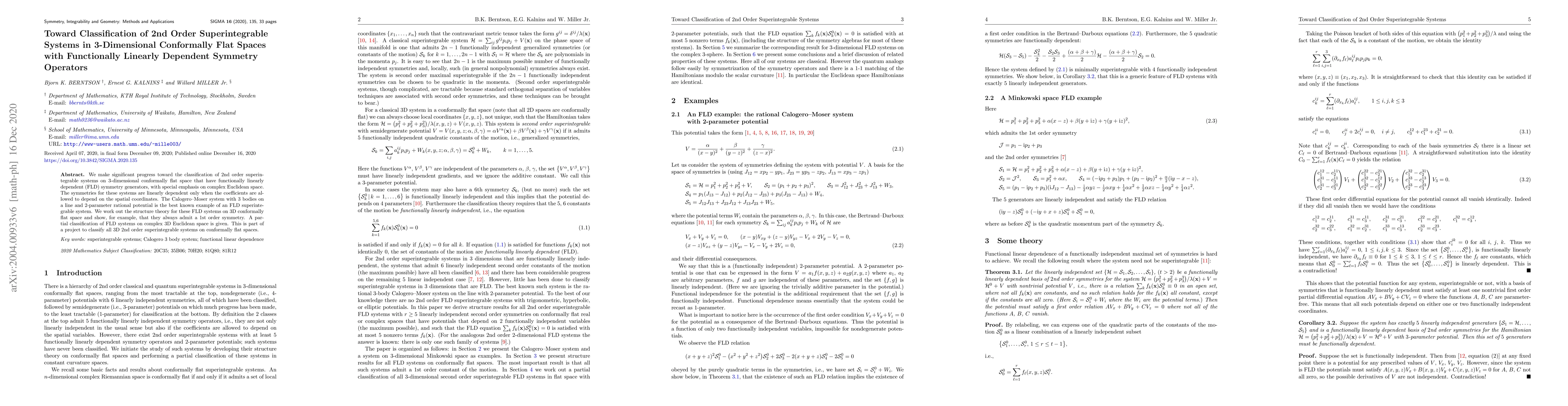 We make significant progress toward the classification of 2nd order superintegrable systems on 3-dimensional conformally flat space that have functionally linearly dependent (FLD) symmetry generators, with special emphasis on complex Euclidean space. The symmetries for these systems are linearly dependent only when the coefficients are allowed to depend on the spatial coordinates. The Calogero-Moser system with 3 bodies on a line and 2-parameter rational potential is the best known example of an FLD superintegrable system. We work out the structure theory for these FLD systems on 3D conformally flat space and show, for example, that they always admit a 1st order symmetry. A partial classification of FLD systems on complex 3D Euclidean space is given. This is part of a project to classify all 3D 2nd order superintegrable systems on conformally flat spaces.