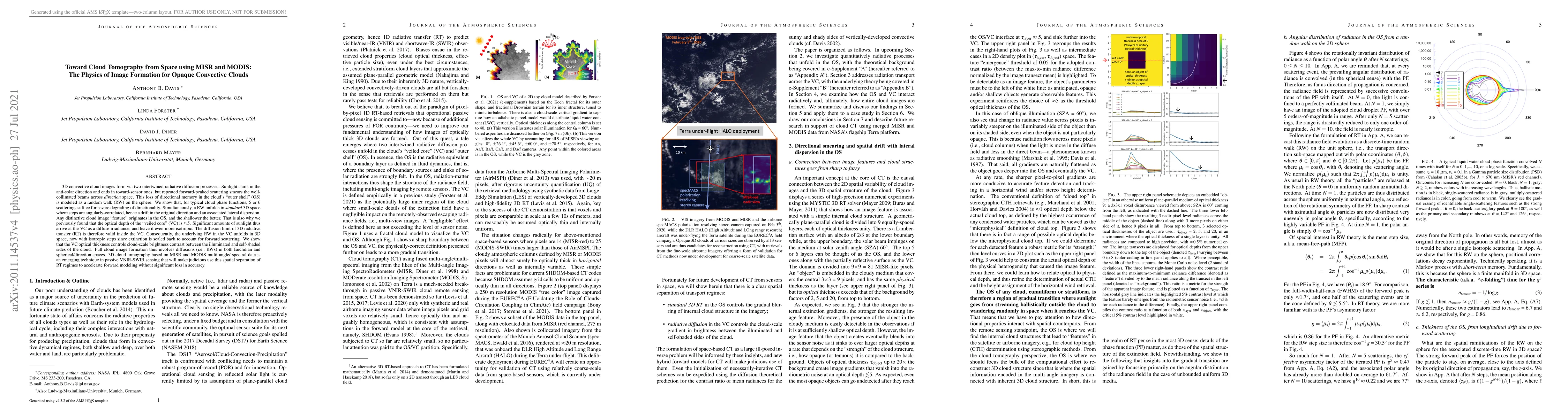 This paper explores the physics of image formation for opaque convective clouds using MISR and MODIS data, revealing that cloud images result from two intertwined radiative diffusion processes. It models the loss of directional memory in cloud scattering as a random walk on the sphere, showing that 5-6 scatterings degrade directionality. The study also describes the diffusion limit of 3D radiative transfer inside the cloud's "veiled core," which controls brightness contrast, and proposes that cloud tomography can leverage these insights for accurate forward modeling.