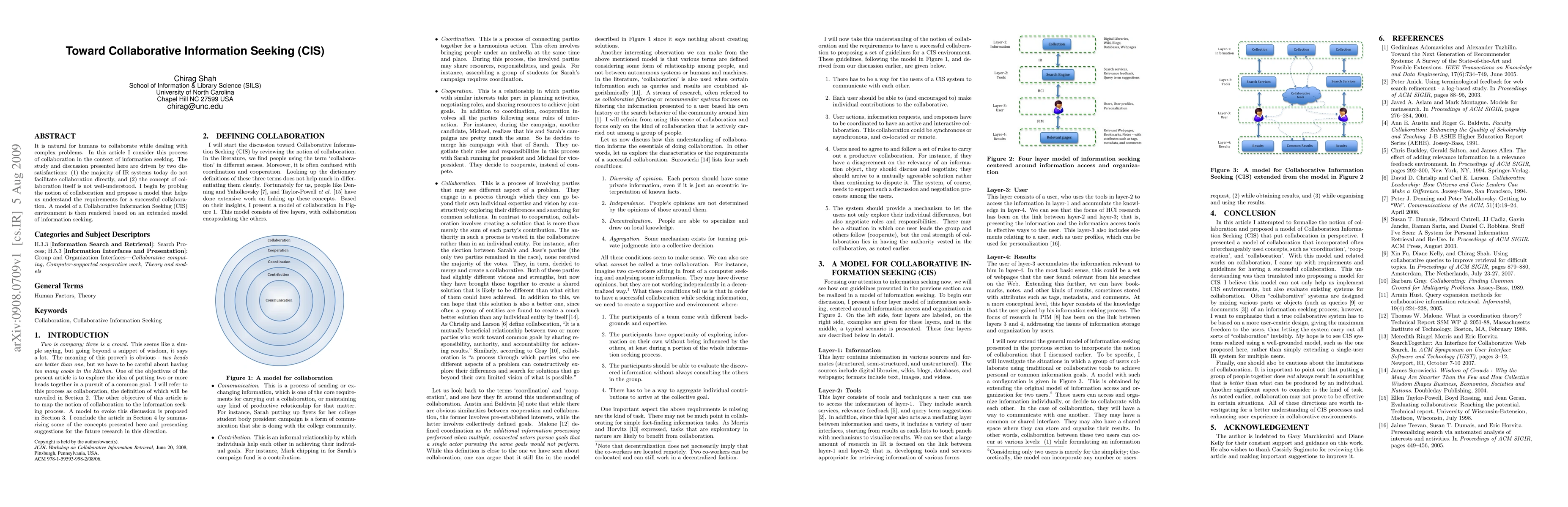 This paper explores the concept of Collaborative Information Seeking (CIS) to address the lack of direct collaboration support in current Information Retrieval (IR) systems and the under-explored nature of collaboration itself. It proposes a model to understand the requirements for successful collaboration and outlines a CIS environment based on an extended information-seeking model.