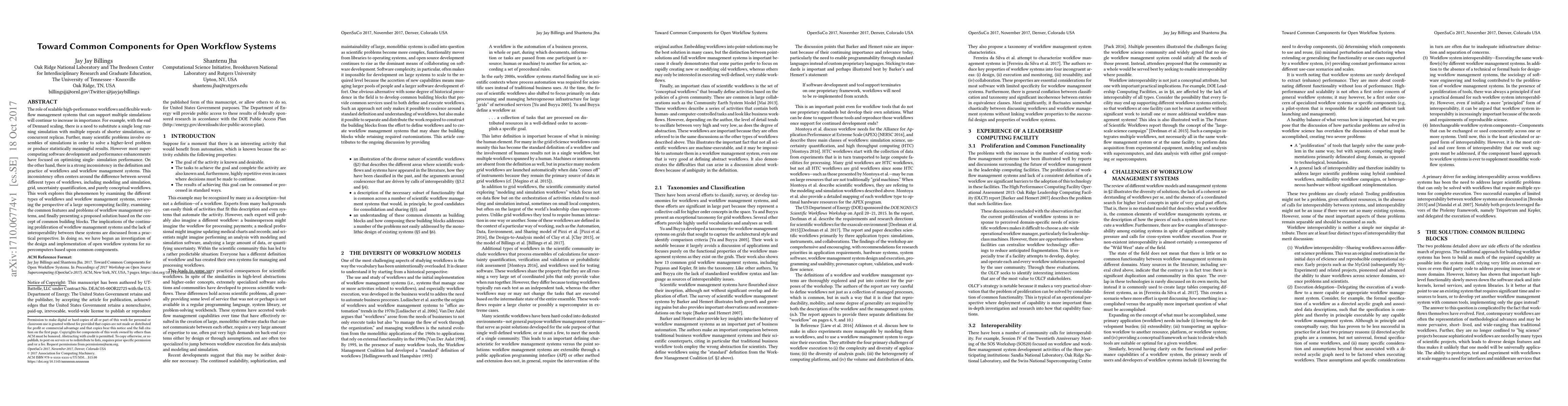 This paper investigates the challenges of scalable high-performance workflows and proposes common components for open workflow systems to enhance interoperability and support multiple simulations, addressing the inconsistency in workflow management systems across different scientific domains. The study aims to develop a solution based on shared building blocks to facilitate ensemble simulations and improve performance.