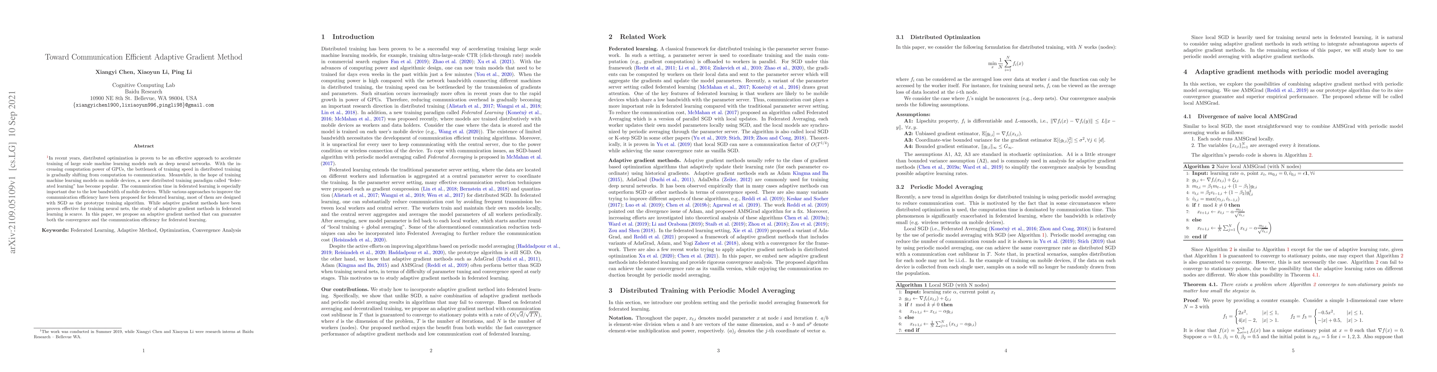 This paper proposes an adaptive gradient method designed to enhance both the convergence and communication efficiency of federated learning, addressing the shift from computational to communication bottlenecks in distributed training, especially on mobile devices. The method aims to improve training speed in large-scale machine learning models while optimizing bandwidth usage.