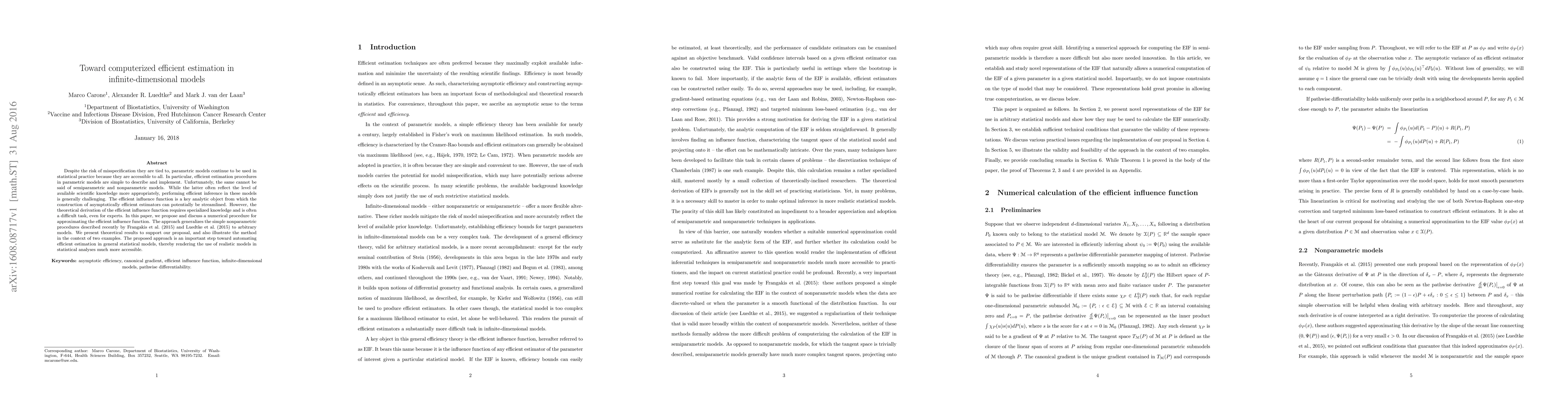 Despite the risk of misspecification they are tied to, parametric models continue to be used in statistical practice because they are accessible to all. In particular, efficient estimation procedures in parametric models are simple to describe and implement. Unfortunately, the same cannot be said of semiparametric and nonparametric models. While the latter often reflect the level of available scientific knowledge more appropriately, performing efficient inference in these models is generally challenging. The efficient influence function is a key analytic object from which the construction of asymptotically efficient estimators can potentially be streamlined. However, the theoretical derivation of the efficient influence function requires specialized knowledge and is often a difficult task, even for experts. In this paper, we propose and discuss a numerical procedure for approximating the efficient influence function. The approach generalizes the simple nonparametric procedures described recently by Frangakis et al. (2015) and Luedtke et al. (2015) to arbitrary models. We present theoretical results to support our proposal, and also illustrate the method in the context of two examples. The proposed approach is an important step toward automating efficient estimation in general statistical models, thereby rendering the use of realistic models in statistical analyses much more accessible.