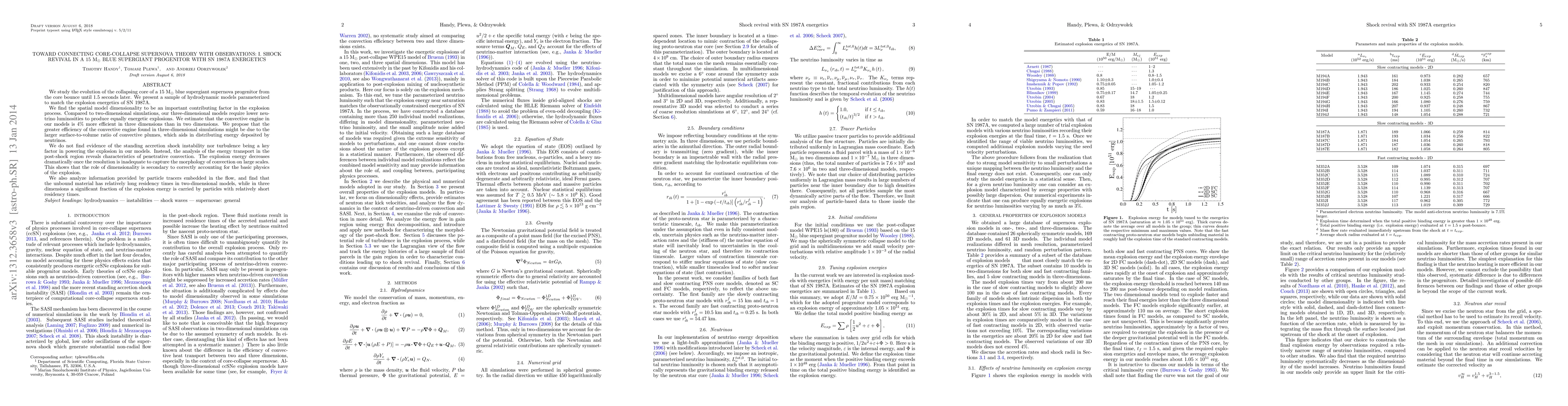 We study the evolution of the collapsing core of a 15 Msun blue supergiant supernova progenitor from the core bounce until 1.5 seconds later. We present a sample of hydrodynamic models parameterized to match the explosion energetics of SN 1987A. We find the spatial model dimensionality to be an important contributing factor in the explosion process. Compared to two-dimensional simulations, our three-dimensional models require lower neutrino luminosities to produce equally energetic explosions. We estimate that the convective engine in our models is 4% more efficient in three dimensions than in two dimensions. We propose that the greater efficiency of the convective engine found in three-dimensional simulations might be due to the larger surface-to-volume ratio of convective plumes, which aids in distributing energy deposited by neutrinos. We do not find evidence of the standing accretion shock instability nor turbulence being a key factor in powering the explosion in our models. Instead, the analysis of the energy transport in the post-shock region reveals characteristics of penetrative convection. The explosion energy decreases dramatically once the resolution is inadequate to capture the morphology of convection on large scales. This shows that the role of dimensionality is secondary to correctly accounting for the basic physics of the explosion. We also analyze information provided by particle tracers embedded in the flow, and find that the unbound material has relatively long residency times in two-dimensional models, while in three dimensions a significant fraction of the explosion energy is carried by particles with relatively short residency times.