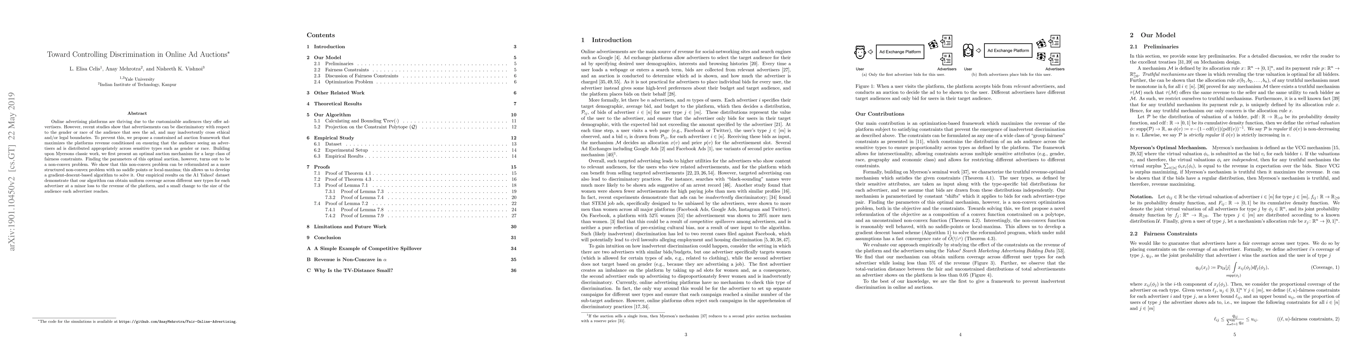 This paper proposes a constrained ad auction framework to prevent discriminatory advertising based on gender or race, leveraging an optimal auction mechanism derived from Myerson's work. It reformulates the non-convex problem of finding optimal parameters into a structured problem, allowing for a gradient-descent-based solution, and demonstrates its effectiveness on the A1 Yahoo! dataset.