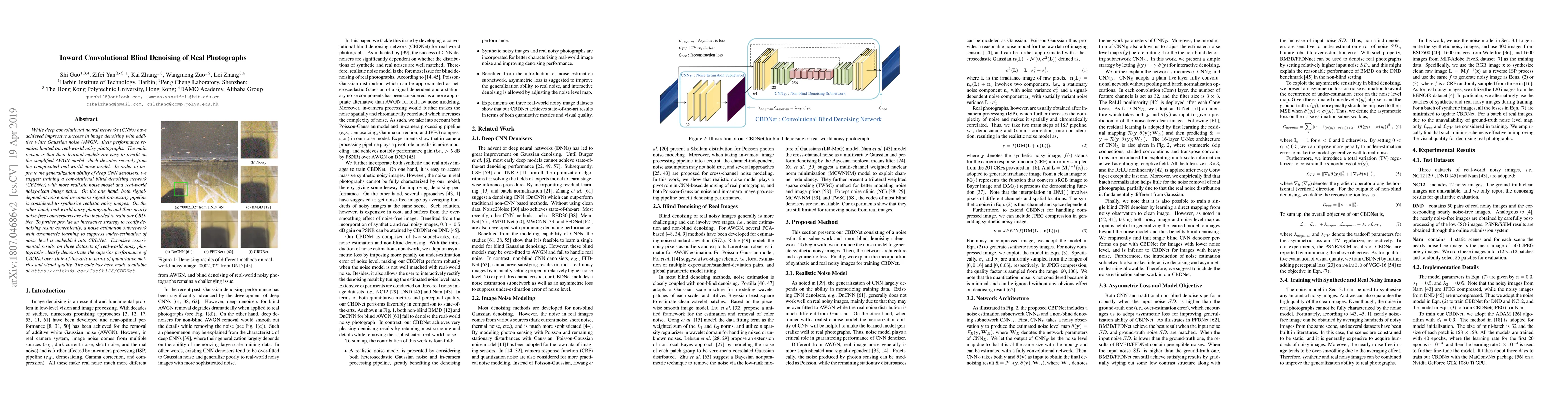 This paper proposes a Convolutional Blind Denoising Network (CBDNet) to enhance the denoising of real-world photographs, addressing the limitations of existing CNNs trained on simplified noise models. The CBDNet incorporates realistic noise and real-world noisy-clean image pairs, and includes a noise estimation subnetwork to improve denoising accuracy. Experimental results show CBDNet outperforms current methods on multiple datasets.