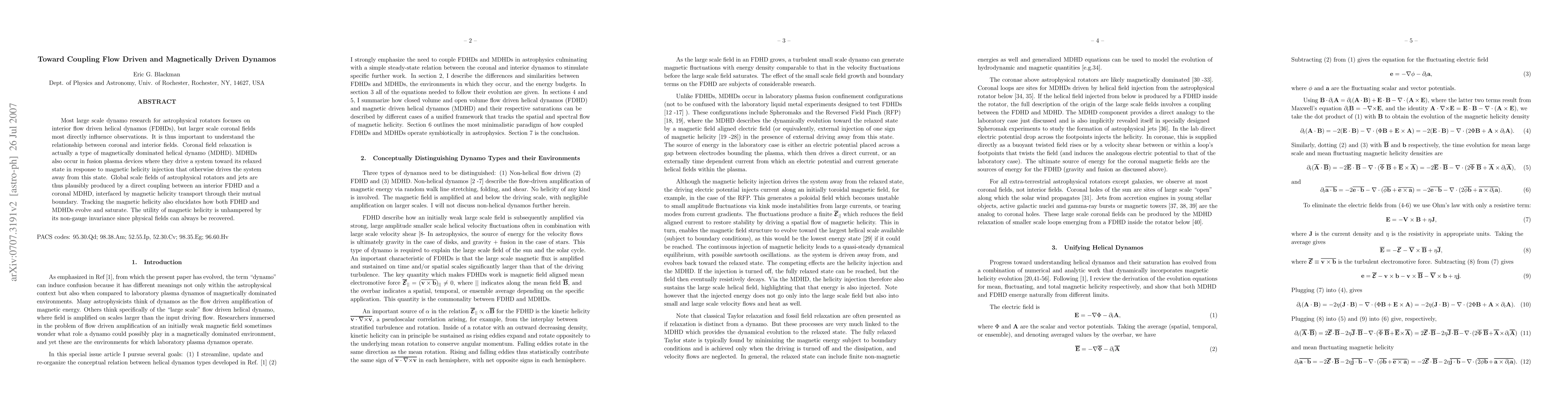 Most large scale dynamo research for astrophysical rotators focuses on interior flow driven helical dynamos (FDHDs), but larger scale coronal fields most directly influence observations. It is thus important to understand the relationship between coronal and interior fields. Coronal field relaxation is actually a type of magnetically dominated helical dynamo (MDHD). MDHDs also occur in fusion plasma devices where they drive a system toward its relaxed state in response to magnetic helicity injection that otherwise drives the system away from this state. Global scale fields of astrophysical rotators and jets are thus plausibly produced by a direct coupling between an interior FDHD and a coronal MDHD, interfaced by magnetic helicity transport through their mutual boundary. Tracking the magnetic helicity also elucidates how both FDHD and MDHDs evolve and saturate. The utility of magnetic helicity is unhampered by its non-gauge invariance since physical fields can always be recovered.