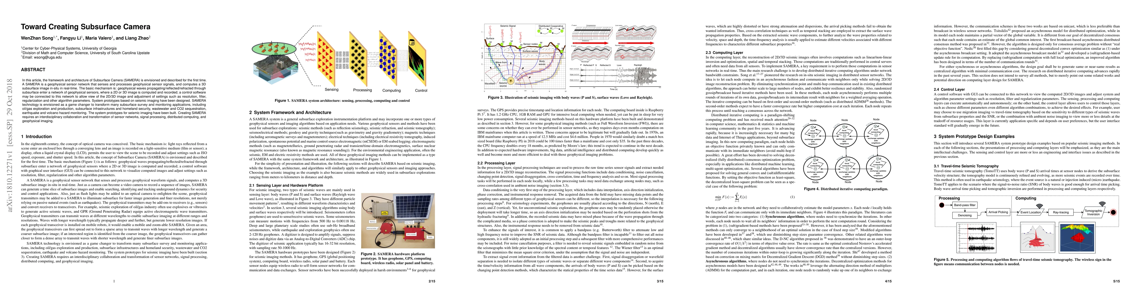 In this article, the framework and architecture of Subsurface Camera (SAMERA) is envisioned and described for the first time. A SAMERA is a geophysical sensor network that senses and processes geophysical sensor signals, and computes a 3D subsurface image in-situ in real-time. The basic mechanism is: geophysical waves propagating/reflected/refracted through subsurface enter a network of geophysical sensors, where a 2D or 3D image is computed and recorded; a control software may be connected to this network to allow view of the 2D/3D image and adjustment of settings such as resolution, filter, regularization and other algorithm parameters. System prototypes based on seismic imaging have been designed. SAMERA technology is envisioned as a game changer to transform many subsurface survey and monitoring applications, including oil/gas exploration and production, subsurface infrastructures and homeland security, wastewater and CO2 sequestration, earthquake and volcano hazard monitoring. The system prototypes for seismic imaging have been built. Creating SAMERA requires an interdisciplinary collaboration and transformation of sensor networks, signal processing, distributed computing, and geophysical imaging.