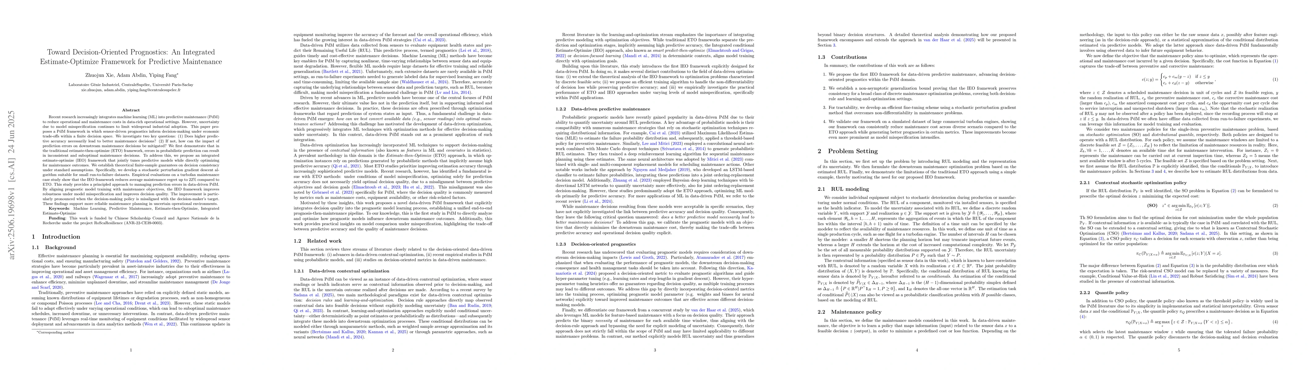 This research introduces an integrated estimate-optimize (IEO) framework for predictive maintenance, addressing the issue of inconsistent decisions due to model misspecification in traditional estimate-then-optimize (ETO) methods. The IEO framework, validated through theoretical guarantees and a turbofan maintenance case study, reduces maintenance regret by up to 22% and improves decision quality by aligning prognostic model training with maintenance objectives, especially in uncertain operational environments.