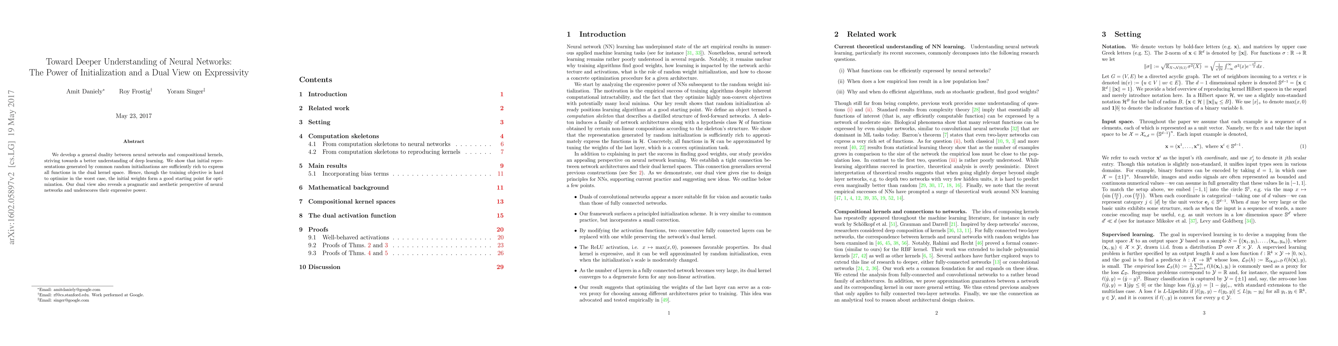 We develop a general duality between neural networks and compositional kernels, striving towards a better understanding of deep learning. We show that initial representations generated by common random initializations are sufficiently rich to express all functions in the dual kernel space. Hence, though the training objective is hard to optimize in the worst case, the initial weights form a good starting point for optimization. Our dual view also reveals a pragmatic and aesthetic perspective of neural networks and underscores their expressive power.