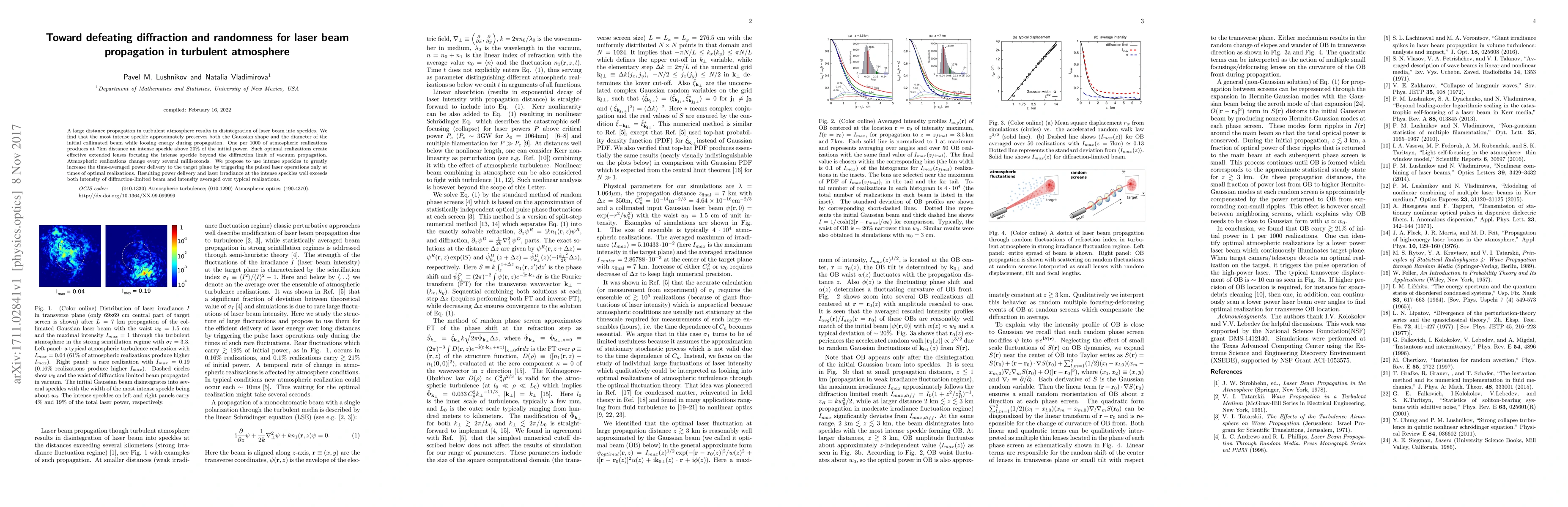This paper investigates the propagation of laser beams through turbulent atmosphere, revealing that intense speckles can maintain the Gaussian shape and diameter of the initial beam while focusing beyond the diffraction limit. By synchronizing pulsed laser operations with optimal atmospheric conditions, the study proposes a method to significantly enhance the time-averaged power delivery to distant targets.