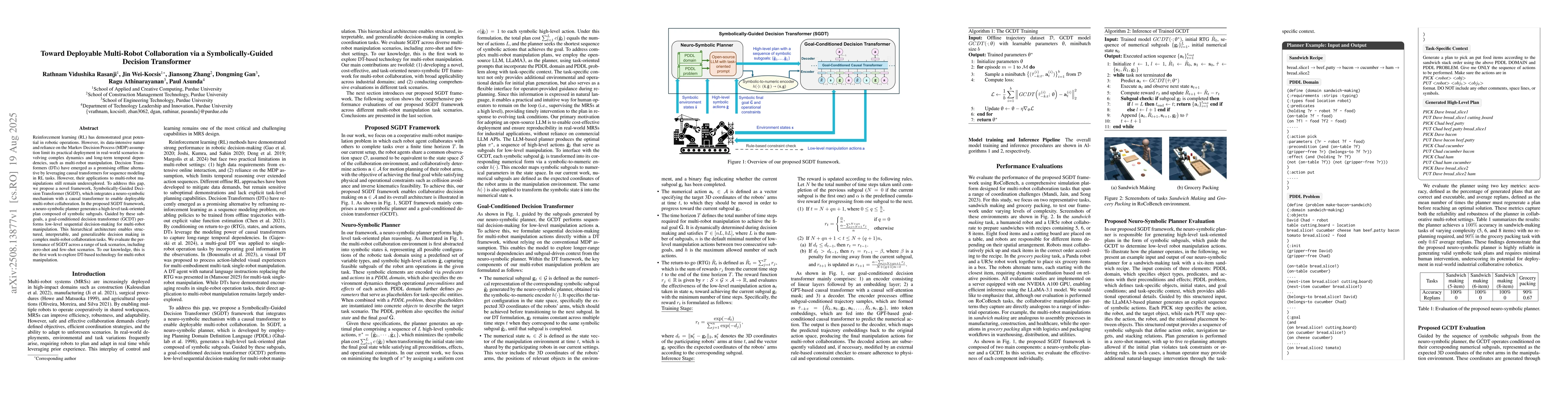 Reinforcement learning (RL) has demonstrated great potential in robotic operations. However, its data-intensive nature and reliance on the Markov Decision Process (MDP) assumption limit its practical deployment in real-world scenarios involving complex dynamics and long-term temporal dependencies, such as multi-robot manipulation. Decision Transformers (DTs) have emerged as a promising offline alternative by leveraging causal transformers for sequence modeling in RL tasks. However, their applications to multi-robot manipulations still remain underexplored. To address this gap, we propose a novel framework, Symbolically-Guided Decision Transformer (SGDT), which integrates a neuro-symbolic mechanism with a causal transformer to enable deployable multi-robot collaboration. In the proposed SGDT framework, a neuro-symbolic planner generates a high-level task-oriented plan composed of symbolic subgoals. Guided by these subgoals, a goal-conditioned decision transformer (GCDT) performs low-level sequential decision-making for multi-robot manipulation. This hierarchical architecture enables structured, interpretable, and generalizable decision making in complex multi-robot collaboration tasks. We evaluate the performance of SGDT across a range of task scenarios, including zero-shot and few-shot scenarios. To our knowledge, this is the first work to explore DT-based technology for multi-robot manipulation.