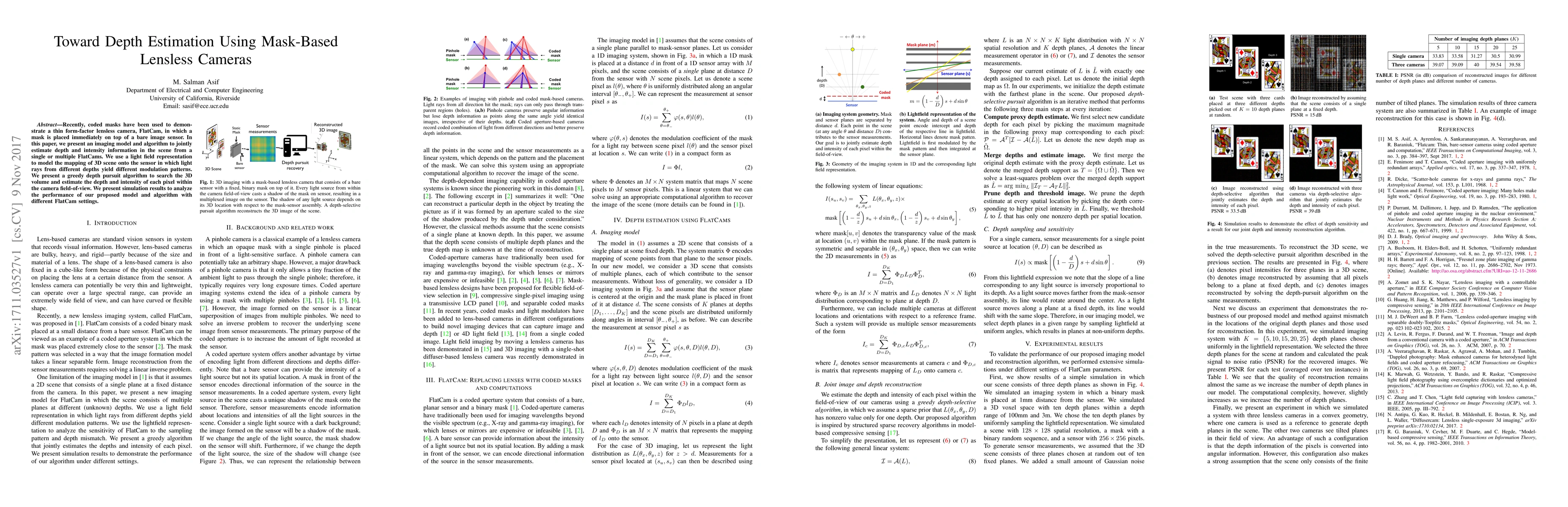 This paper proposes an imaging model and algorithm for estimating depth and intensity using mask-based lensless cameras called FlatCams. It employs a light field representation to map 3D scenes onto the sensor and introduces a greedy depth pursuit algorithm to estimate pixel depth and intensity, validated through simulation.