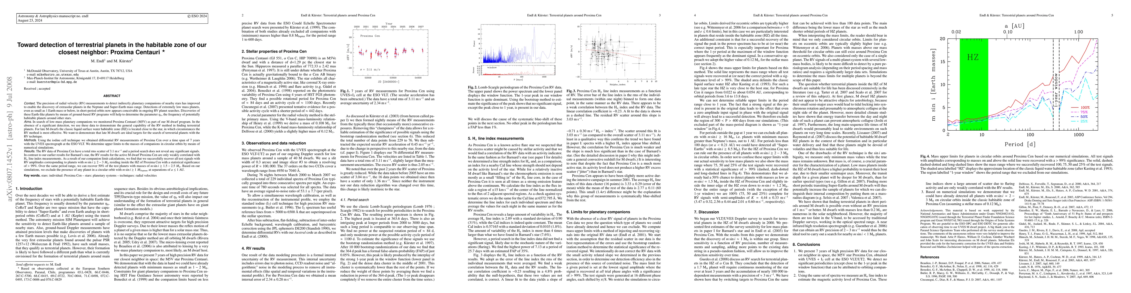 This paper investigates the use of radial velocity measurements to detect potentially habitable terrestrial planets around Proxima Centauri. It demonstrates the effectiveness of the RV method for detecting low-mass planets in the habitable zones of late M dwarfs, establishing upper limits for possible planetary companions in Proxima Cen's orbit.