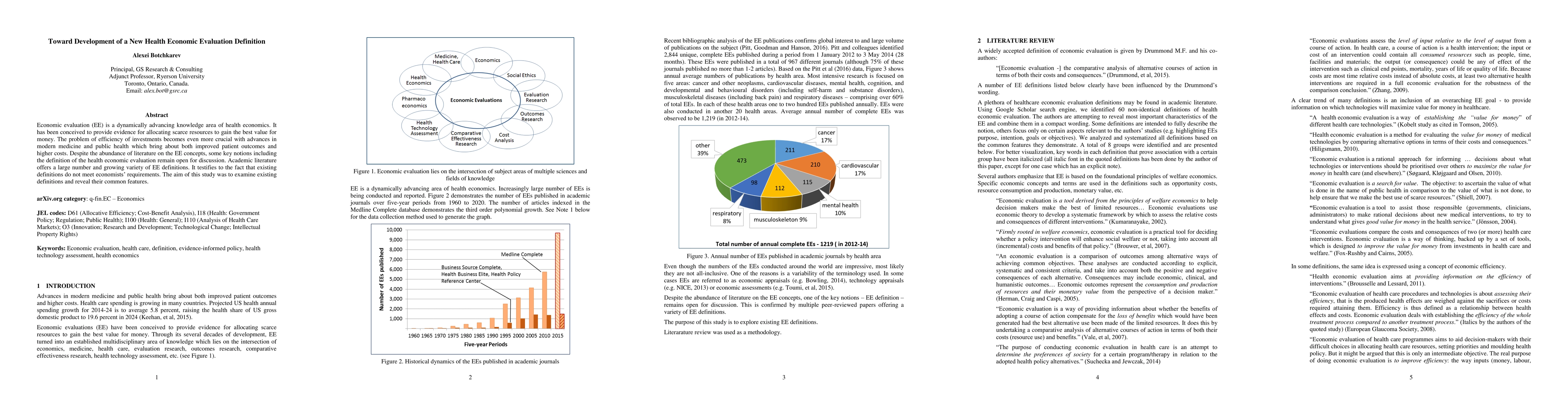 Economic evaluation is a dynamically advancing knowledge area of health economics. It has been conceived to provide evidence for allocating scarce resources to gain the best value for money. The problem of efficiency of investments becomes even more crucial with advances in modern medicine and public health which bring about both improved patient outcomes and higher costs. Despite the abundance of literature on the economic evaluation concepts, some key notions including the definition of the health economic evaluation remain open for discussion. Academic literature offers a large number and growing variety of economic evaluation definitions. It testifies to the fact that existing definitions do not meet requirements of economists. The aim of this study was to examine existing definitions and reveal their common features.