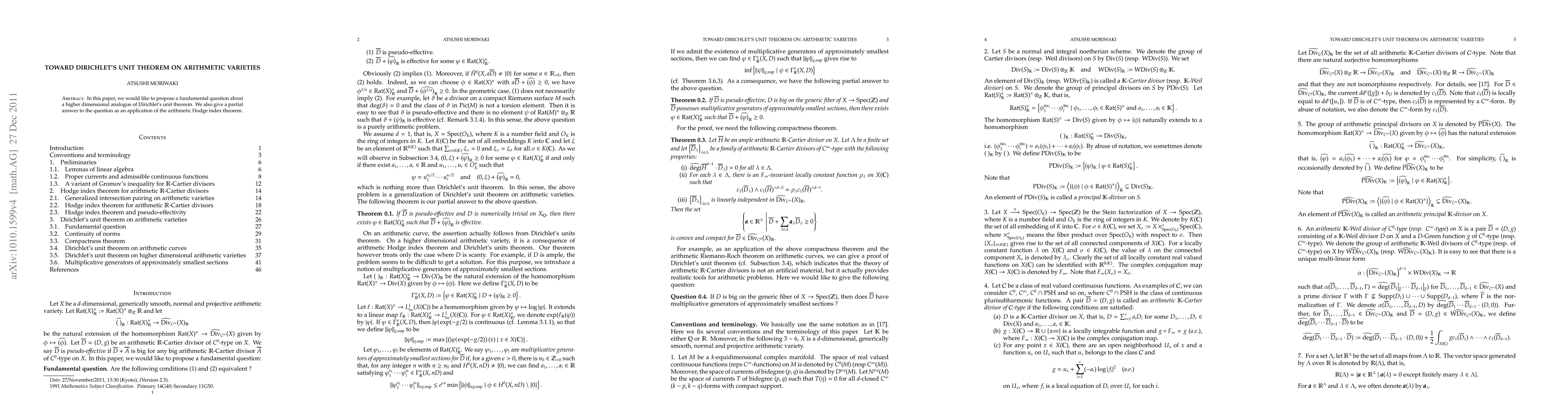 This paper explores a higher-dimensional analogue of Dirichlet's unit theorem for arithmetic varieties and provides a partial answer using the arithmetic Hodge index theorem. The work aims to extend classical number theory results to more complex geometric settings.