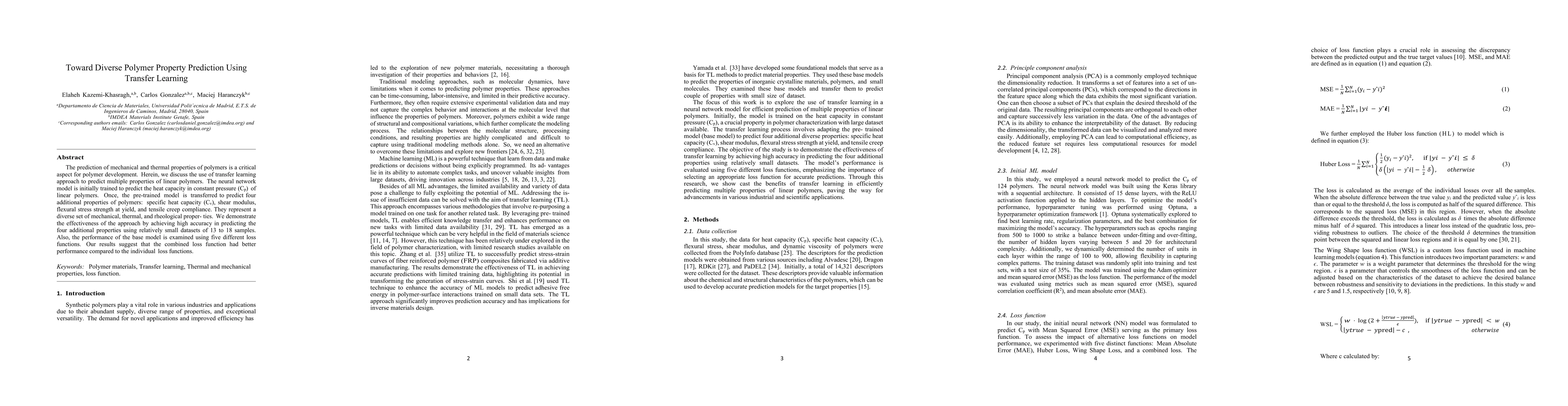 This paper explores the use of transfer learning to predict diverse polymer properties, starting with a neural network trained to predict heat capacity. The pre-trained model is then adapted to predict additional mechanical, thermal, and rheological properties with high accuracy using small datasets, demonstrating the effectiveness of the combined loss function over individual ones.