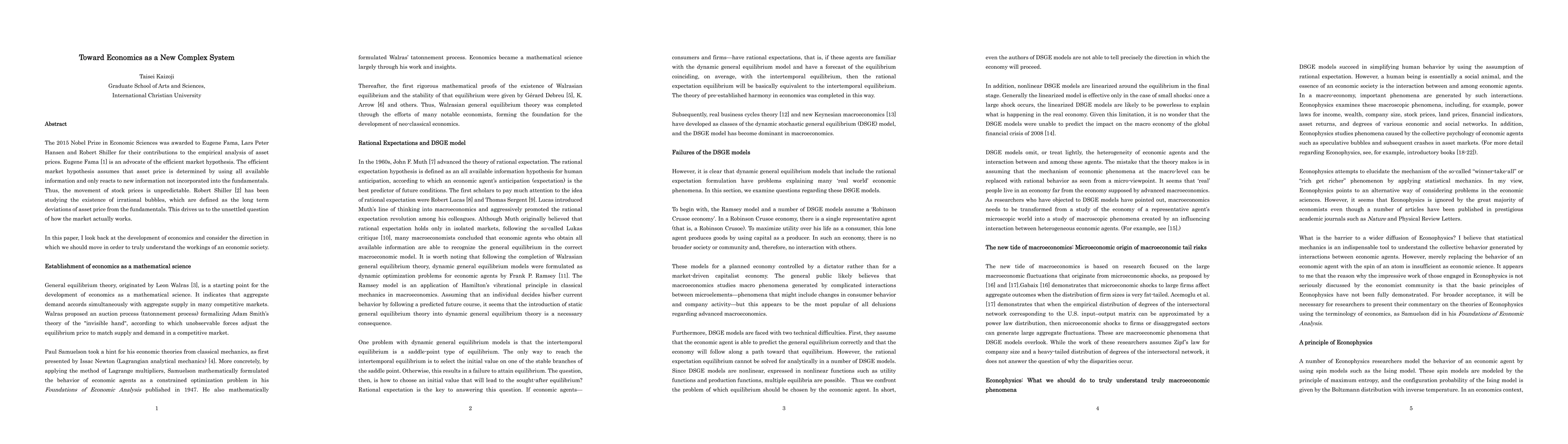 The 2015 Nobel Prize in Economic Sciences was awarded to Eugene Fama, Lars Peter Hansen and Robert Shiller for their contributions to the empirical analysis of asset prices. Eugene Fama [1] is an advocate of the efficient market hypothesis. The efficient market hypothesis assumes that asset price is determined by using all available information and only reacts to new information not incorporated into the fundamentals. Thus, the movement of stock prices is unpredictable. Robert Shiller [2] has been studying the existence of irrational bubbles, which are defined as the long term deviations of asset price from the fundamentals. This drives us to the unsettled question of how the market actually works. In this paper, I look back at the development of economics and consider the direction in which we should move in order to truly understand the workings of an economic society.