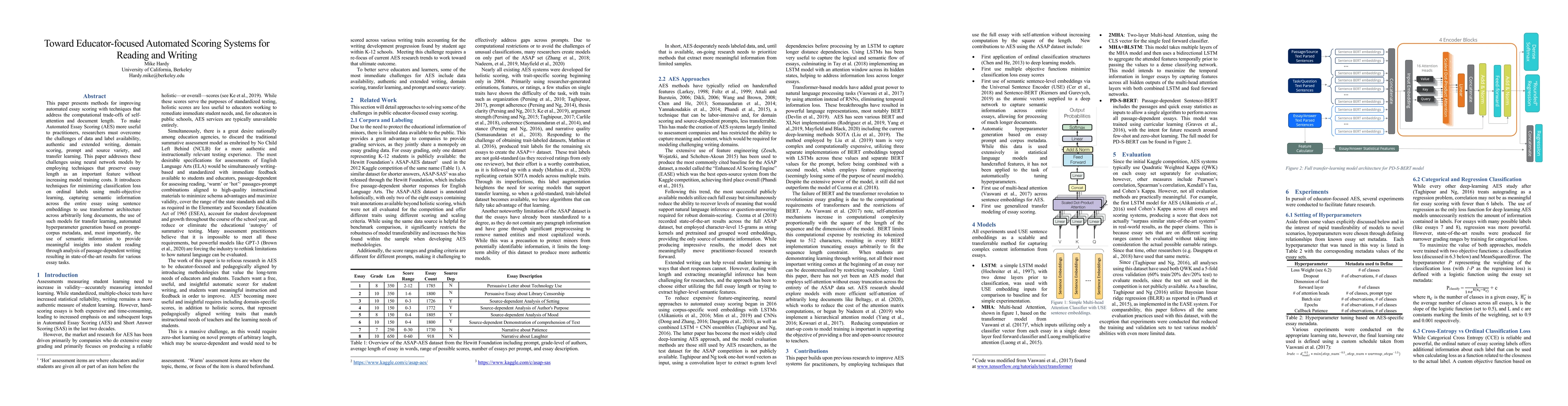 This paper presents methods for improving automated essay scoring with techniques that address the computational trade-offs of self-attention and document length. To make Automated Essay Scoring (AES) more useful to practitioners, researchers must overcome the challenges of data and label availability, authentic and extended writing, domain scoring, prompt and source variety, and transfer learning. This paper addresses these challenges using neural network models by employing techniques that preserve essay length as an important feature without increasing model training costs. It introduces techniques for minimizing classification loss on ordinal labels using multi-objective learning, capturing semantic information across the entire essay using sentence embeddings to use transformer architecture across arbitrarily long documents, the use of such models for transfer learning, automated hyperparameter generation based on prompt-corpus metadata, and, most importantly, the use of semantic information to provide meaningful insights into student reading through analysis of passage-dependent writing resulting in state-of-the-art results for various essay tasks.