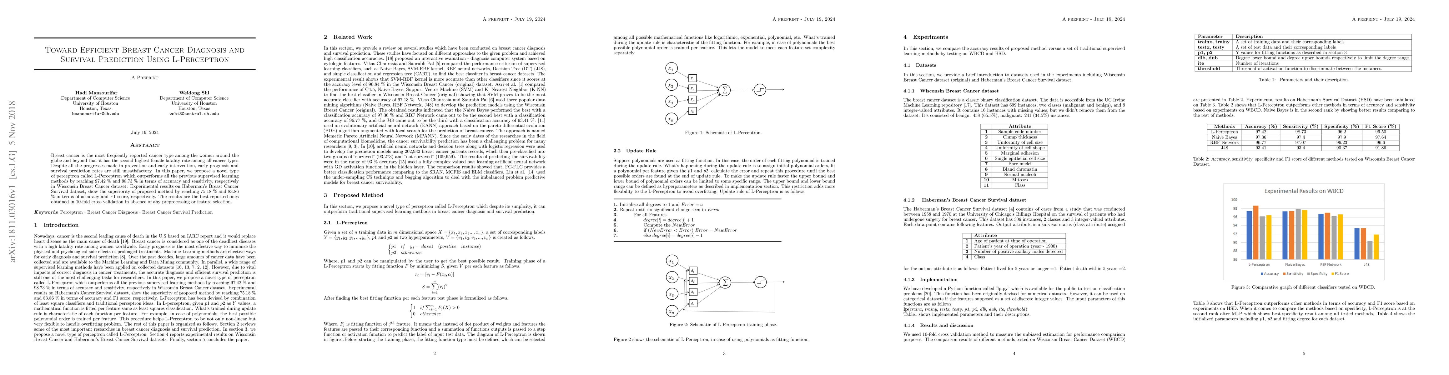 This paper introduces an L-Perceptron for efficient breast cancer diagnosis and survival prediction, achieving 97.42% accuracy and 98.73% sensitivity on the Wisconsin Breast Cancer dataset. On Haberman's dataset, it reaches 75.18% accuracy and 83.86% F1 score, outperforming previous methods without preprocessing or feature selection.