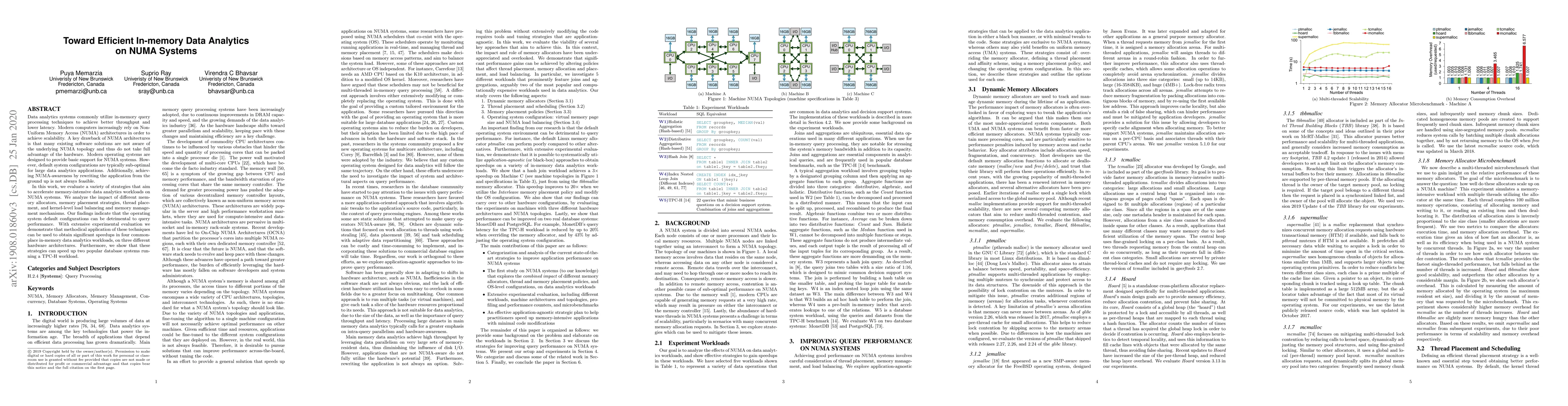 This paper explores strategies to enhance in-memory data analytics performance on NUMA systems by optimizing memory allocators, memory placement, thread placement, and kernel-level mechanisms. Experimental results show significant speedups across various workloads and hardware architectures.