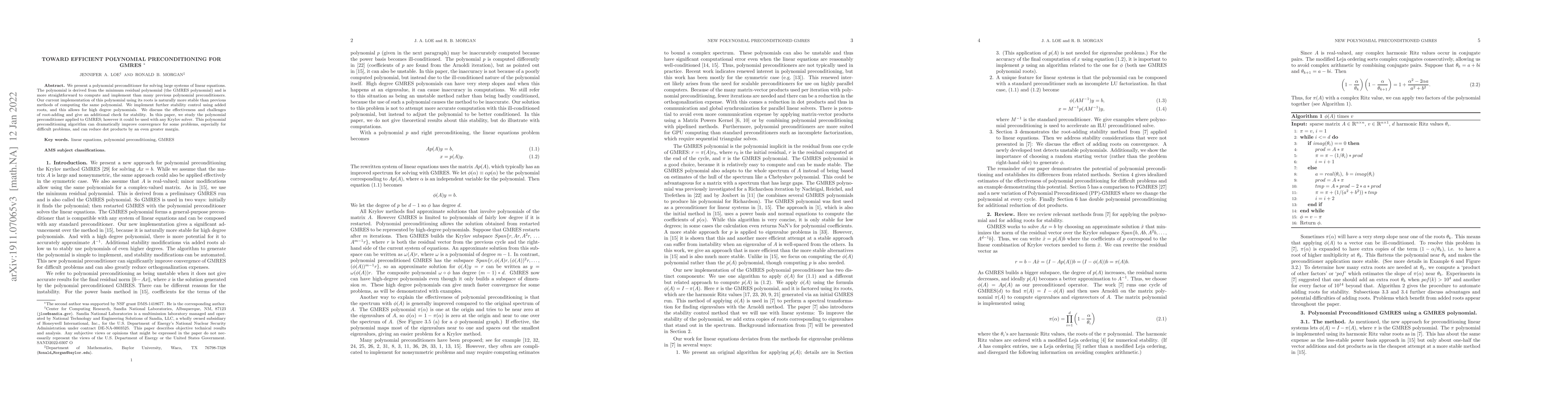 This paper introduces a polynomial preconditioner derived from the GMRES polynomial, which is easier to compute and more stable than previous methods. The authors implement stability control through added roots and discuss the challenges and effectiveness of this approach, showing significant improvements in convergence for difficult linear systems.