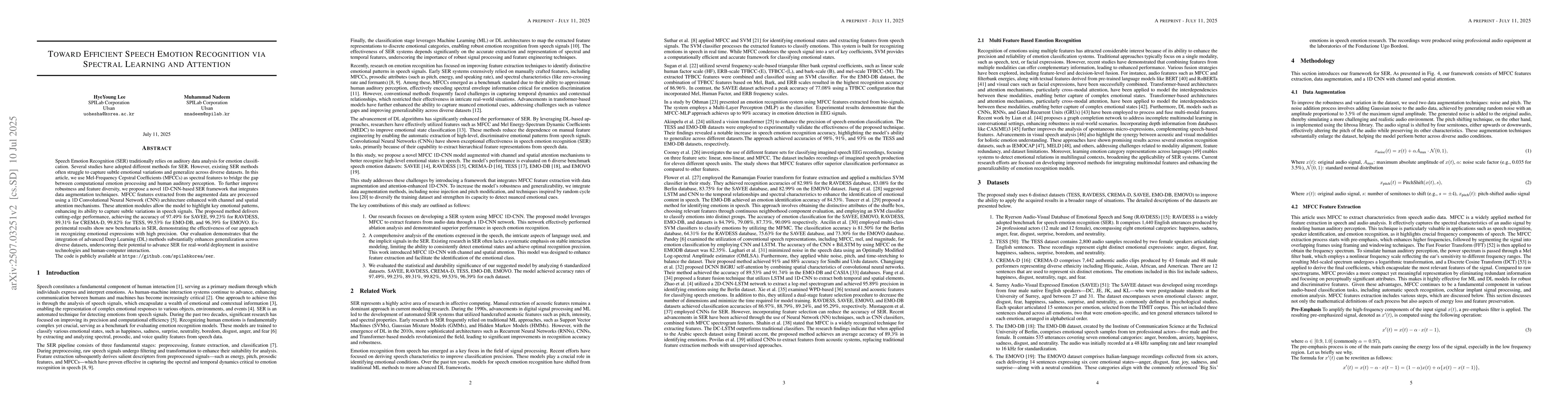 Speech Emotion Recognition (SER) traditionally relies on auditory data analysis for emotion classification. Several studies have adopted different methods for SER. However, existing SER methods often struggle to capture subtle emotional variations and generalize across diverse datasets. In this article, we use Mel-Frequency Cepstral Coefficients (MFCCs) as spectral features to bridge the gap between computational emotion processing and human auditory perception. To further improve robustness and feature diversity, we propose a novel 1D-CNN-based SER framework that integrates data augmentation techniques. MFCC features extracted from the augmented data are processed using a 1D Convolutional Neural Network (CNN) architecture enhanced with channel and spatial attention mechanisms. These attention modules allow the model to highlight key emotional patterns, enhancing its ability to capture subtle variations in speech signals. The proposed method delivers cutting-edge performance, achieving the accuracy of 97.49% for SAVEE, 99.23% for RAVDESS, 89.31% for CREMA-D, 99.82% for TESS, 99.53% for EMO-DB, and 96.39% for EMOVO. Experimental results show new benchmarks in SER, demonstrating the effectiveness of our approach in recognizing emotional expressions with high precision. Our evaluation demonstrates that the integration of advanced Deep Learning (DL) methods substantially enhances generalization across diverse datasets, underscoring their potential to advance SER for real-world deployment in assistive technologies and human-computer interaction.