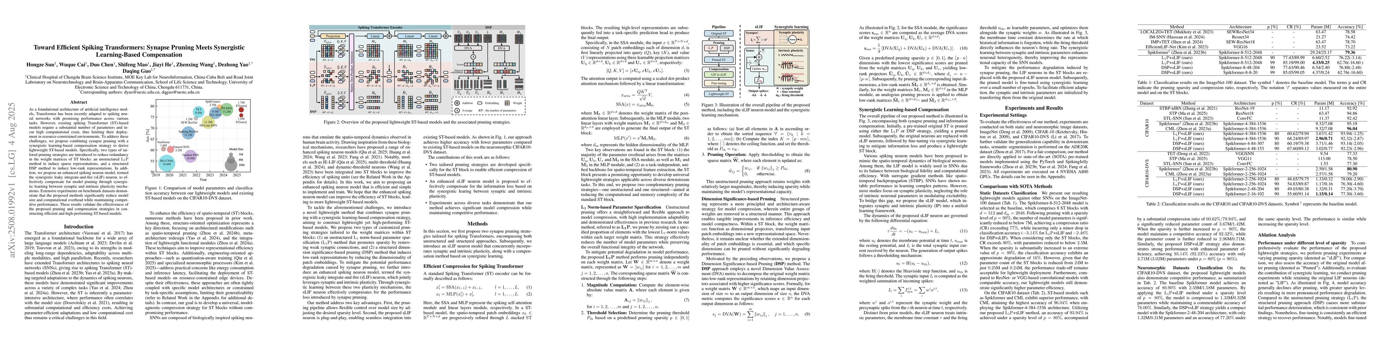 As a foundational architecture of artificial intelligence models, Transformer has been recently adapted to spiking neural networks with promising performance across various tasks. However, existing spiking Transformer (ST)-based models require a substantial number of parameters and incur high computational costs, thus limiting their deployment in resource-constrained environments. To address these challenges, we propose combining synapse pruning with a synergistic learning-based compensation strategy to derive lightweight ST-based models. Specifically, two types of tailored pruning strategies are introduced to reduce redundancy in the weight matrices of ST blocks: an unstructured $\mathrm{L_{1}P}$ method to induce sparse representations, and a structured DSP method to induce low-rank representations. In addition, we propose an enhanced spiking neuron model, termed the synergistic leaky integrate-and-fire (sLIF) neuron, to effectively compensate for model pruning through synergistic learning between synaptic and intrinsic plasticity mechanisms. Extensive experiments on benchmark datasets demonstrate that the proposed methods significantly reduce model size and computational overhead while maintaining competitive performance. These results validate the effectiveness of the proposed pruning and compensation strategies in constructing efficient and high-performing ST-based models.