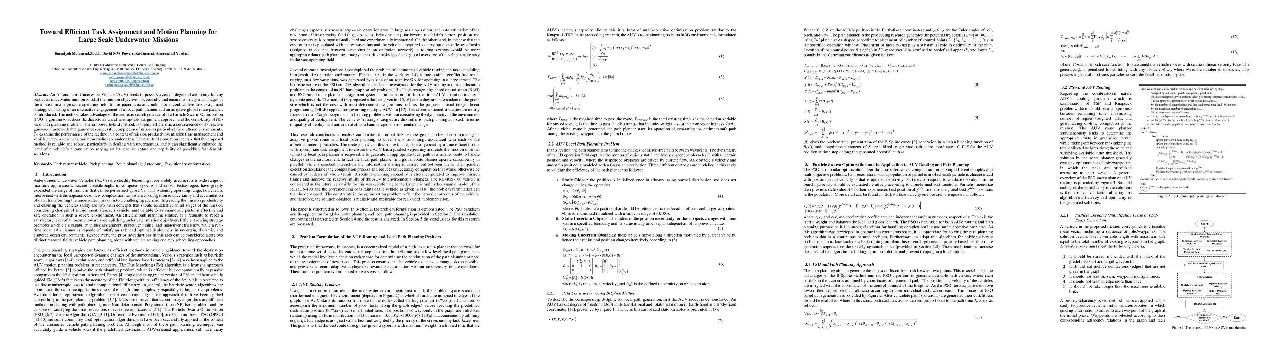 This paper introduces a novel combinatorial task assignment strategy for Autonomous Underwater Vehicles using a hybrid approach combining local and global path planners, optimized by Particle Swarm Optimisation. The method enhances mission productivity, time management, and vehicle safety through efficient, reactive guidance in complex environments.