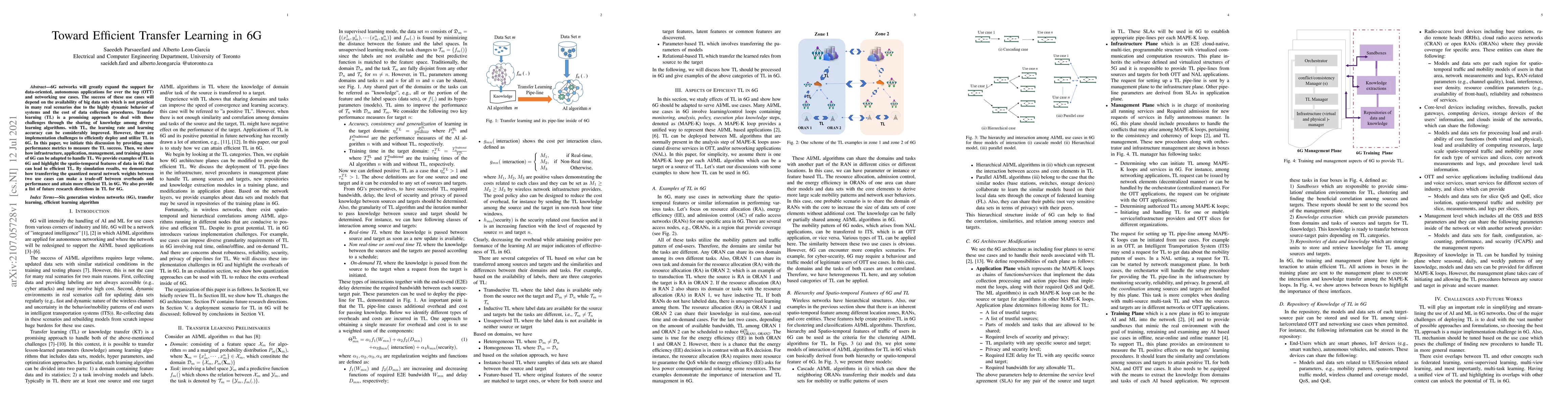 6G networks will greatly expand the support for data-oriented, autonomous applications for over the top (OTT) and networking use cases. The success of these use cases will depend on the availability of big data sets which is not practical in many real scenarios due to the highly dynamic behavior of systems and the cost of data collection procedures. Transfer learning (TL) is a promising approach to deal with these challenges through the sharing of knowledge among diverse learning algorithms. with TL, the learning rate and learning accuracy can be considerably improved. However, there are implementation challenges to efficiently deploy and utilize TL in 6G. In this paper, we initiate this discussion by providing some performance metrics to measure the TL success. Then, we show how infrastructure, application, management, and training planes of 6G can be adapted to handle TL. We provide examples of TL in 6G and highlight the spatio-temporal features of data in 6G that can lead to efficient TL. By simulation results, we demonstrate how transferring the quantized neural network weights between two use cases can make a trade-off between overheads and performance and attain more efficient TL in 6G. We also provide a list of future research directions in TL for 6G.