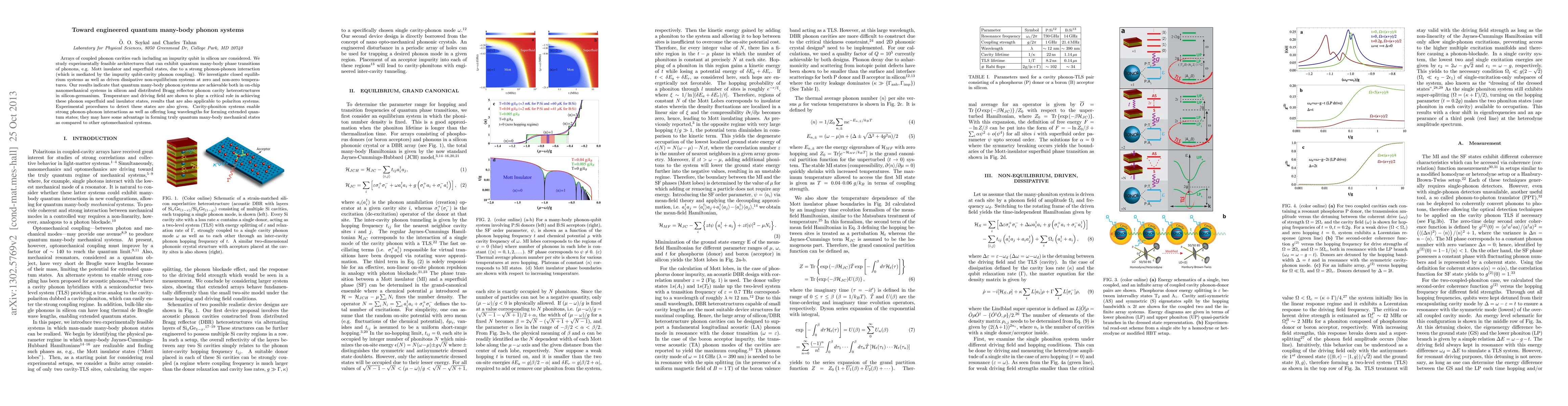 Arrays of coupled phonon cavities each including an impurity qubit in silicon are considered. We study experimentally feasible architectures that can exhibit quantum many-body phase transitions of phonons, e.g. Mott insulator and superfluid states, due to a strong phonon-phonon interaction (which is mediated by the impurity qubit-cavity phonon coupling). We investigate closed equilibrium systems as well as driven dissipative non-equilibrium systems at zero and non-zero temperatures. Our results indicate that quantum many-body phonon systems are achievable both in on-chip nanomechanical systems in silicon and distributed Bragg reflector phonon cavity heterostructures in silicon-germanium. Temperature and driving field are shown to play a critical role in achieving these phonon superfluid and insulator states, results that are also applicable to polariton systems. Experimental procedures to detect these states are also given. Cavity-phoniton systems enable strong phonon-phonon interactions as well as offering long wavelengths for forming extended quantum states; they may have some advantage in forming truly quantum many-body mechanical states as compared to other optomechanical systems.