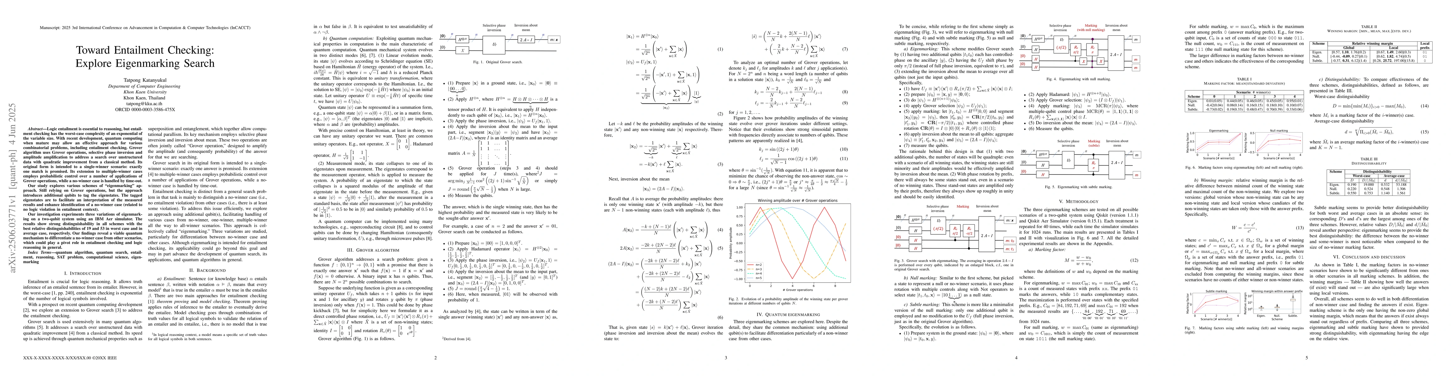 Logic entailment is essential to reasoning, but entailment checking has the worst-case complexity of an exponential of the variable size. With recent development, quantum computing when mature may allow an effective approach for various combinatorial problems, including entailment checking. Grover algorithm uses Grover operations, selective phase inversion and amplitude amplification to address a search over unstructured data with quadratic improvement from a classical method. Its original form is intended to a single-winner scenario: exactly one match is promised. Its extension to multiple-winner cases employs probabilistic control over a number of applications of Grover operations, while a no-winner case is handled by time-out. Our study explores various schemes of ``eigenmarking'' approach. Still relying on Grover operations, but the approach introduces additional qubits to tag the eigenstates. The tagged eigenstates are to facilitate an interpretation of the measured results and enhance identification of a no-winner case (related to no logic violation in entailment context). Our investigation experiments three variations of eigenmarking on a two-qubit system using an IBM Aer simulator. The results show strong distinguishability in all schemes with the best relative distinguishabilities of 19 and 53 in worst case and in average case, respectively. Our findings reveal a viable quantum mechanism to differentiate a no-winner case from other scenarios, which could play a pivot role in entailment checking and logic reasoning in general.