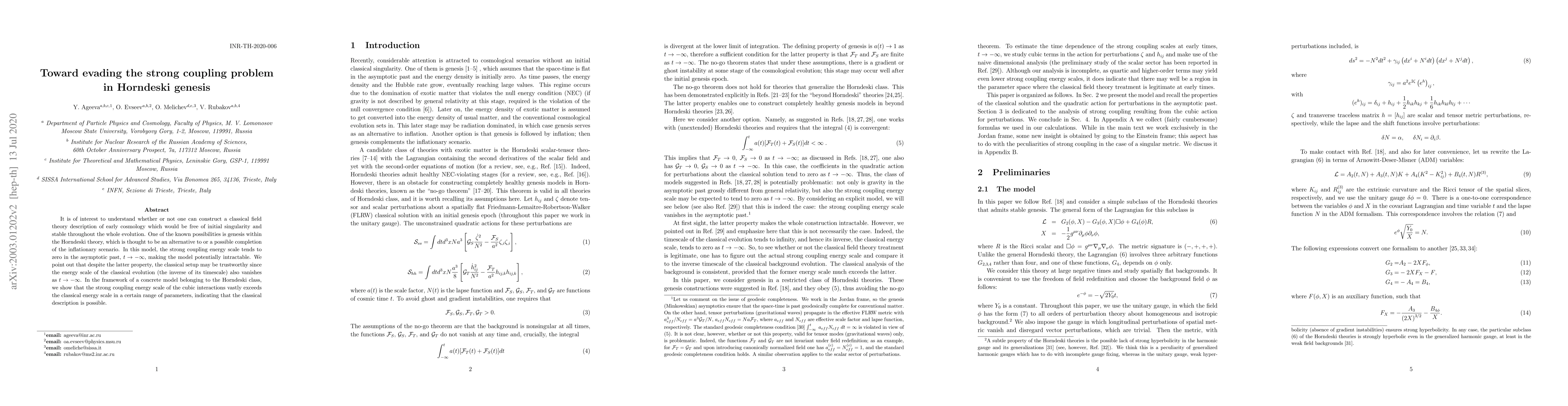 This paper explores the feasibility of constructing a classical field theory in Horndeski theory that avoids initial singularities and remains stable throughout cosmological evolution. It demonstrates that despite the strong coupling energy scale tending to zero in the asymptotic past, the classical energy scale also vanishes, suggesting that a classical description is viable in certain parameter ranges.