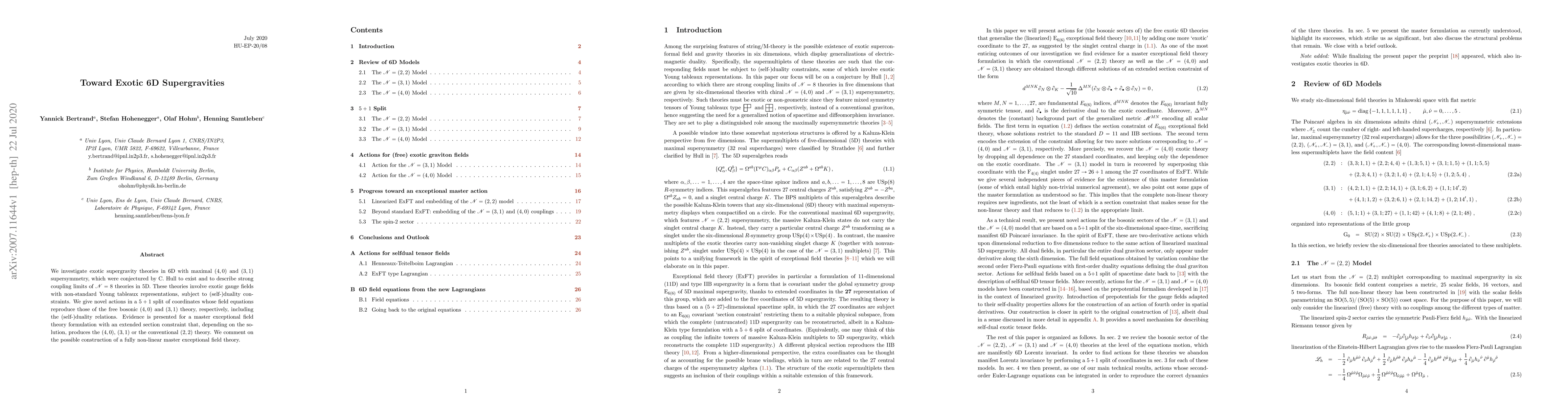 This paper explores exotic 6D supergravity theories with maximal (4,0) and (3,1) supersymmetry, proposing novel actions that reproduce the field equations of these theories. It suggests a master exceptional field theory formulation that can produce different supergravity theories depending on the solution.