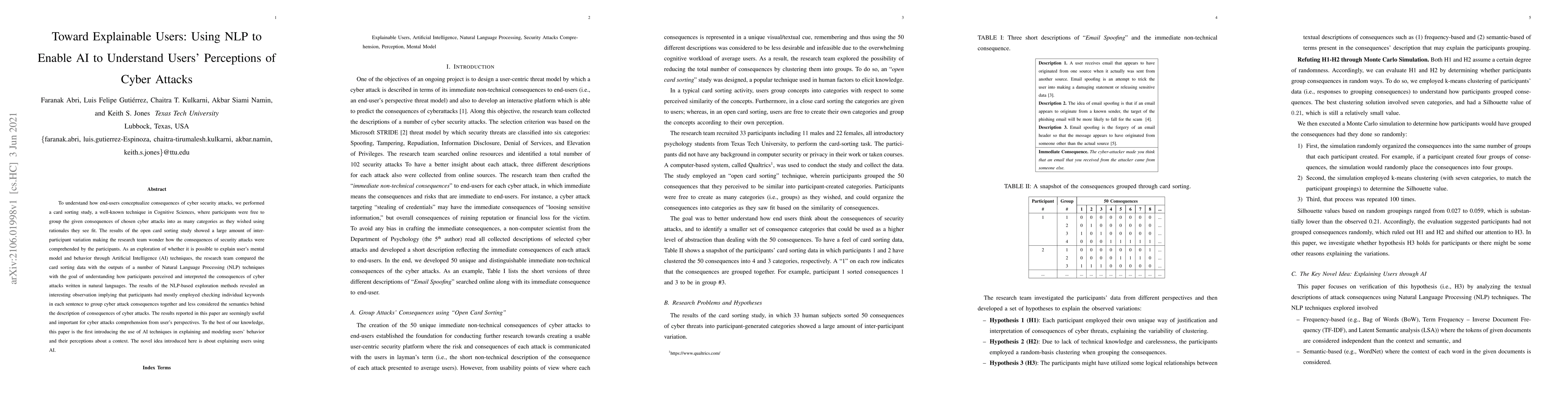 To understand how end-users conceptualize consequences of cyber security attacks, we performed a card sorting study, a well-known technique in Cognitive Sciences, where participants were free to group the given consequences of chosen cyber attacks into as many categories as they wished using rationales they see fit. The results of the open card sorting study showed a large amount of inter-participant variation making the research team wonder how the consequences of security attacks were comprehended by the participants. As an exploration of whether it is possible to explain user's mental model and behavior through Artificial Intelligence (AI) techniques, the research team compared the card sorting data with the outputs of a number of Natural Language Processing (NLP) techniques with the goal of understanding how participants perceived and interpreted the consequences of cyber attacks written in natural languages. The results of the NLP-based exploration methods revealed an interesting observation implying that participants had mostly employed checking individual keywords in each sentence to group cyber attack consequences together and less considered the semantics behind the description of consequences of cyber attacks. The results reported in this paper are seemingly useful and important for cyber attacks comprehension from user's perspectives. To the best of our knowledge, this paper is the first introducing the use of AI techniques in explaining and modeling users' behavior and their perceptions about a context. The novel idea introduced here is about explaining users using AI.