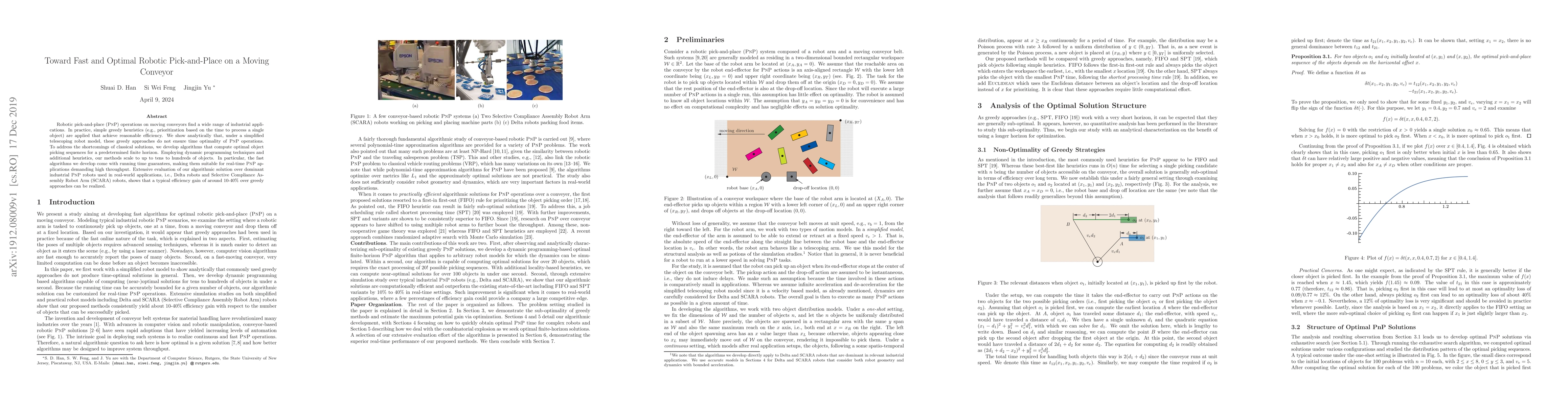 Researchers developed algorithms to optimize robotic pick-and-place operations on moving conveyors, achieving efficiency gains of 10-40% over greedy approaches. Their methods provide fast solutions suitable for real-time applications with guaranteed running times.