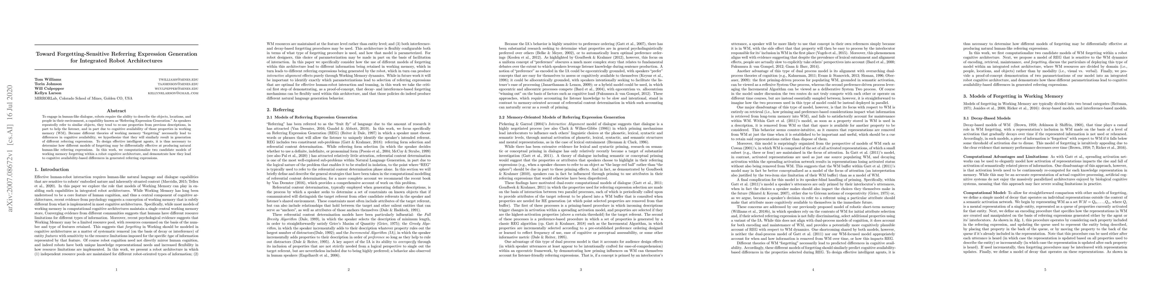 To engage in human-like dialogue, robots require the ability to describe the objects, locations, and people in their environment, a capability known as "Referring Expression Generation." As speakers repeatedly refer to similar objects, they tend to re-use properties from previous descriptions, in part to help the listener, and in part due to cognitive availability of those properties in working memory (WM). Because different theories of working memory "forgetting" necessarily lead to differences in cognitive availability, we hypothesize that they will similarly result in generation of different referring expressions. To design effective intelligent agents, it is thus necessary to determine how different models of forgetting may be differentially effective at producing natural human-like referring expressions. In this work, we computationalize two candidate models of working memory forgetting within a robot cognitive architecture, and demonstrate how they lead to cognitive availability-based differences in generated referring expressions.