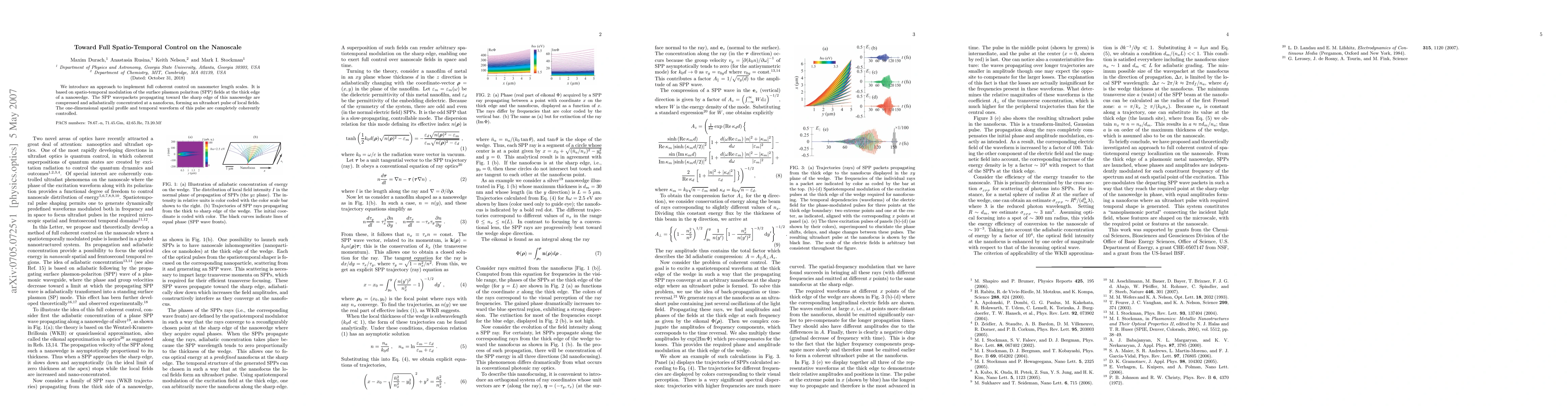 We introduce an approach to implement full coherent control on nanometer length scales. It is based on spatio-temporal modulation of the surface plasmon polariton (SPP) fields at the thick edge of a nanowedge. The SPP wavepackets propagating toward the sharp edge of this nanowedge are compressed and adiabatically concentrated at a nanofocus, forming an ultrashort pulse of local fields. The one-dimensional spatial profile and temporal waveform of this pulse are completely coherently controlled.