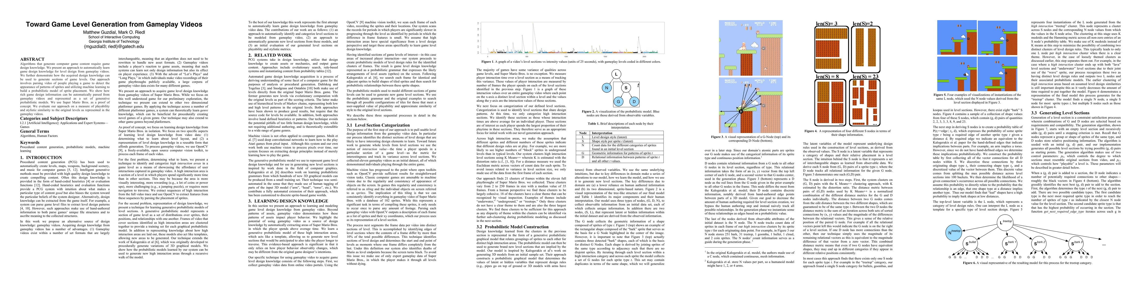 This paper proposes an algorithm to automatically generate game levels by learning design knowledge from gameplay videos. It uses machine learning to parse video data and build probabilistic models for sprite placement, demonstrating the approach with Super Mario Bros. and evaluating on playability and stylistic similarity.