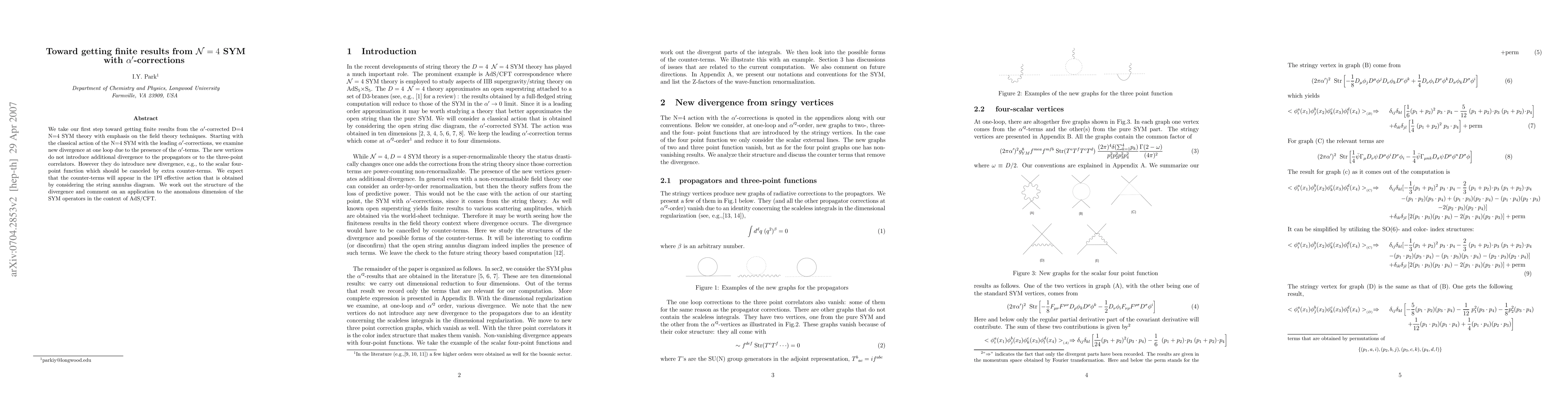 We take our first step toward getting finite results from the alpha'-corrected D=4 N=4 SYM theory with emphasis on the field theory techniques. Starting with the classical action of N=4 SYM with the leading alpha'-corrections, we examine new divergence at one loop due to the presence of the alpha'-terms. The new vertices do not introduce additional divergence to the propagators or to the three-point correlators. However they do introduce new divergence, e.g., to the scalar four-point function which should be canceled by extra counter-terms. We expect that the counter-terms will appear in the 1PI effective action that is obtained by considering the string annulus diagram. We work out the structure of the divergence and comment on an application to the anomalous dimension of the SYM operators in the context of AdS/CFT.