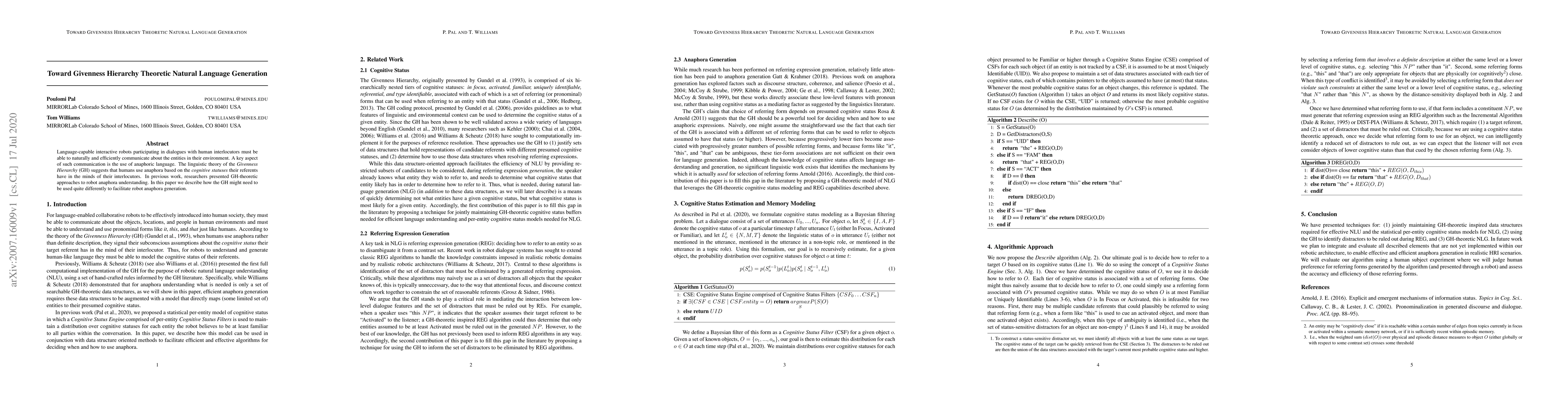 Language-capable interactive robots participating in dialogues with human interlocutors must be able to naturally and efficiently communicate about the entities in their environment. A key aspect of such communication is the use of anaphoric language. The linguistic theory of the Givenness Hierarchy(GH) suggests that humans use anaphora based on the cognitive statuses their referents have in the minds of their interlocutors. In previous work, researchers presented GH-theoretic approaches to robot anaphora understanding. In this paper we describe how the GH might need to be used quite differently to facilitate robot anaphora generation.